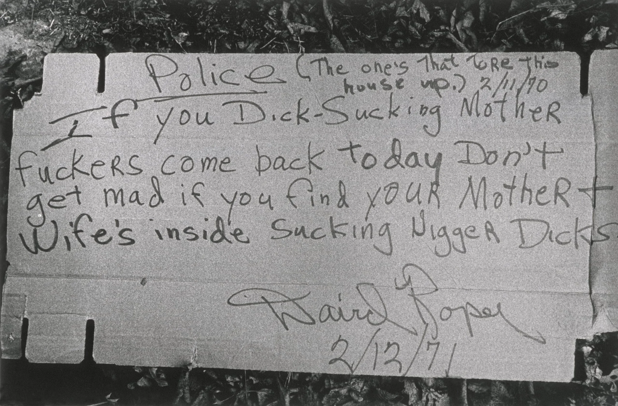Black and white photograph of a handwritten note on flattened cardboard lying on the ground among leaves, signed 'Baird Pope' and dated