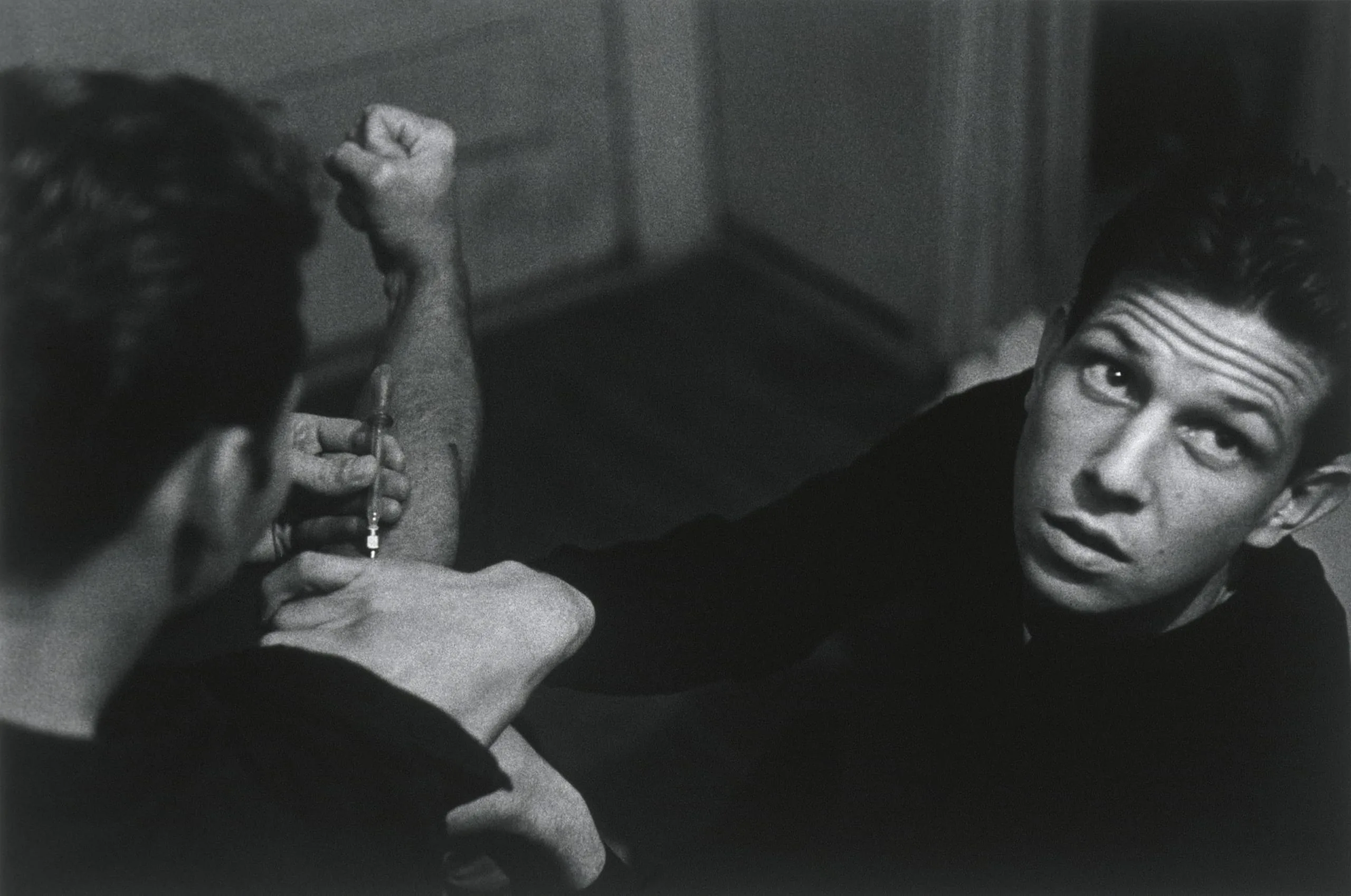 Black and white photograph, two men indoors, one facing away holding a syringe to his raised arm, the other reclining and looking upward