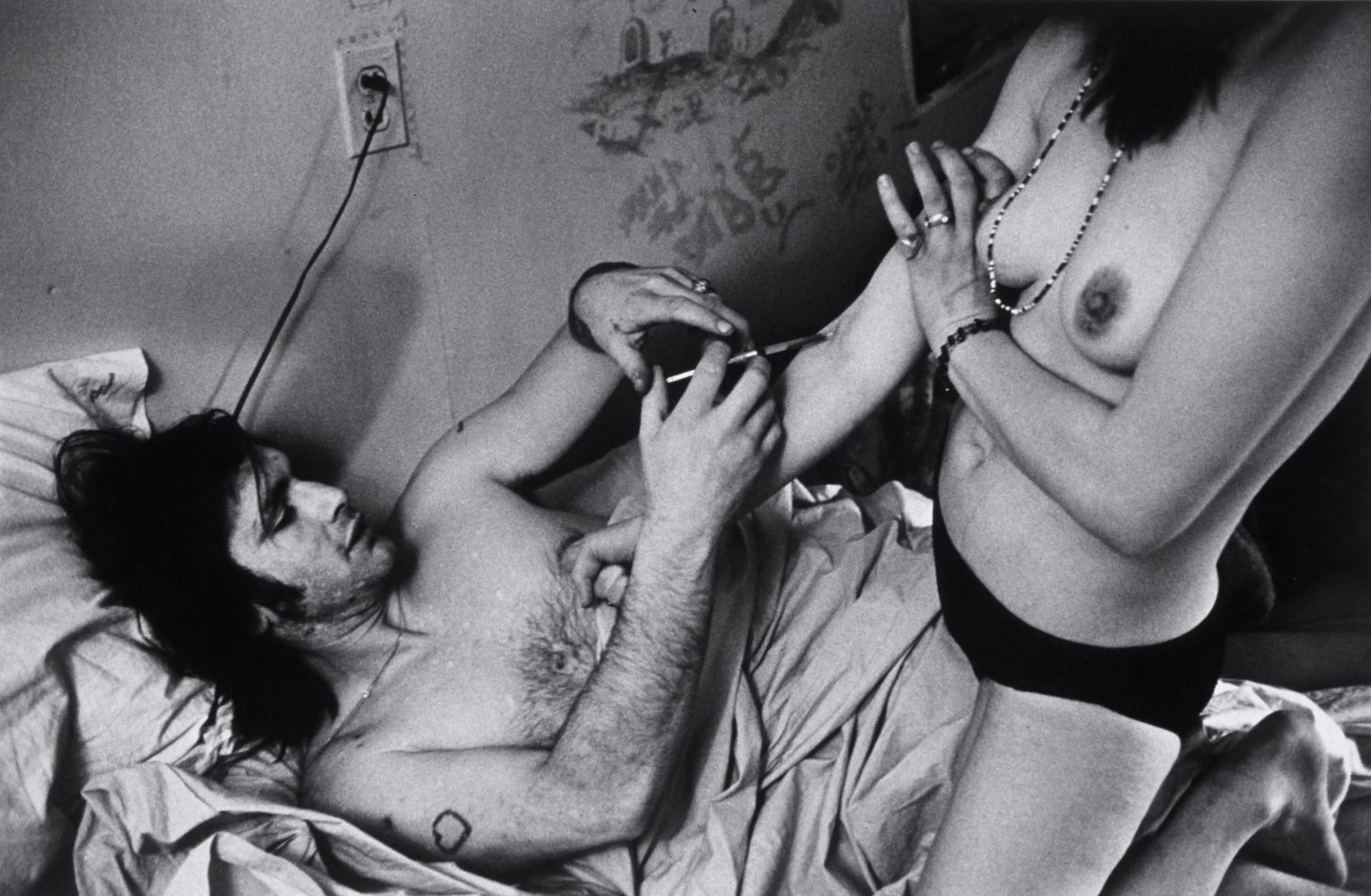 Black and white photograph of a shirtless man lying on a bed holding a syringe toward the arm of a topless woman standing beside him