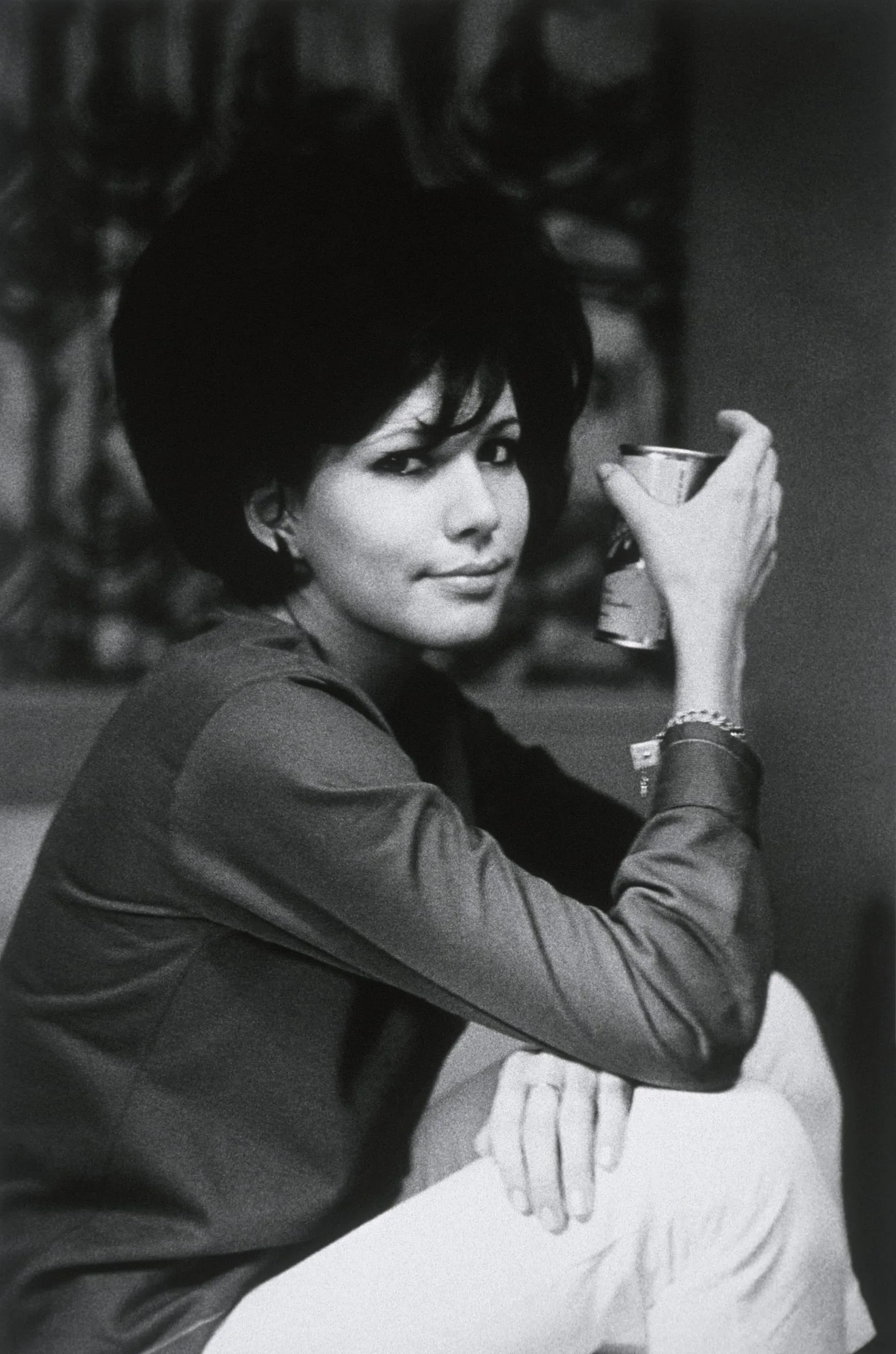 Black and white portrait photograph of a seated woman holding a small metal cup near her face, wearing a dark long-sleeved top, looking directly at the camera