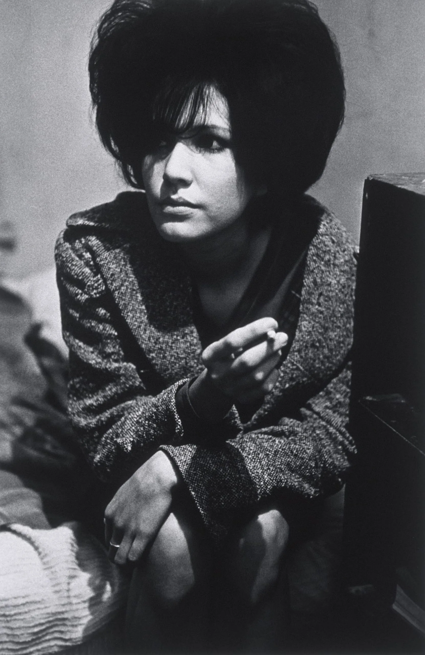 Black and white photograph, a young woman seated on the floor looking upward, wearing a textured gray hoodie, photographed from above with high-contrast directional lighting
