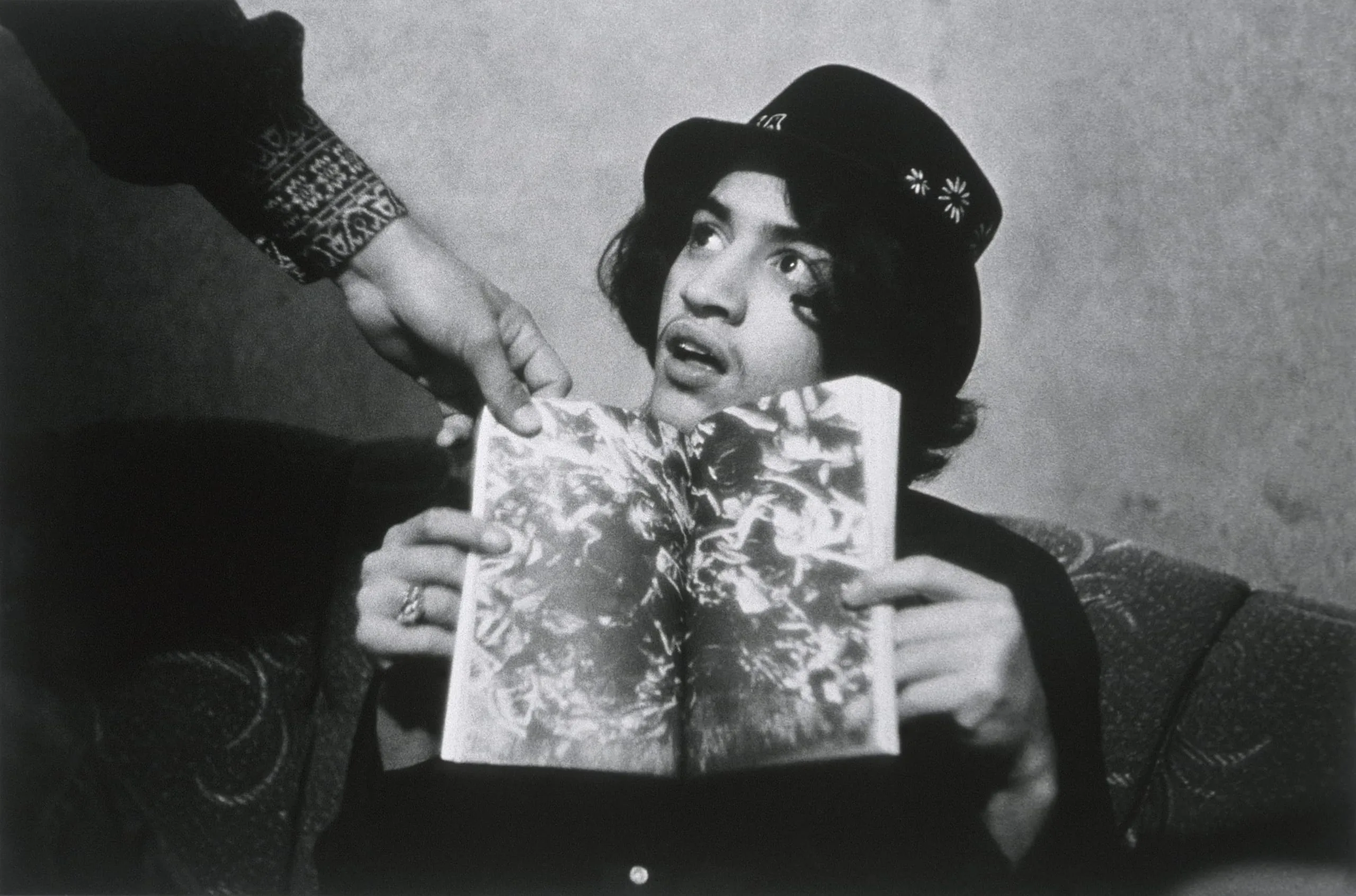 Black and white photograph looking down at a person in a dark cap holding an open book upward, a second hand reaching in from the left to point at the pages