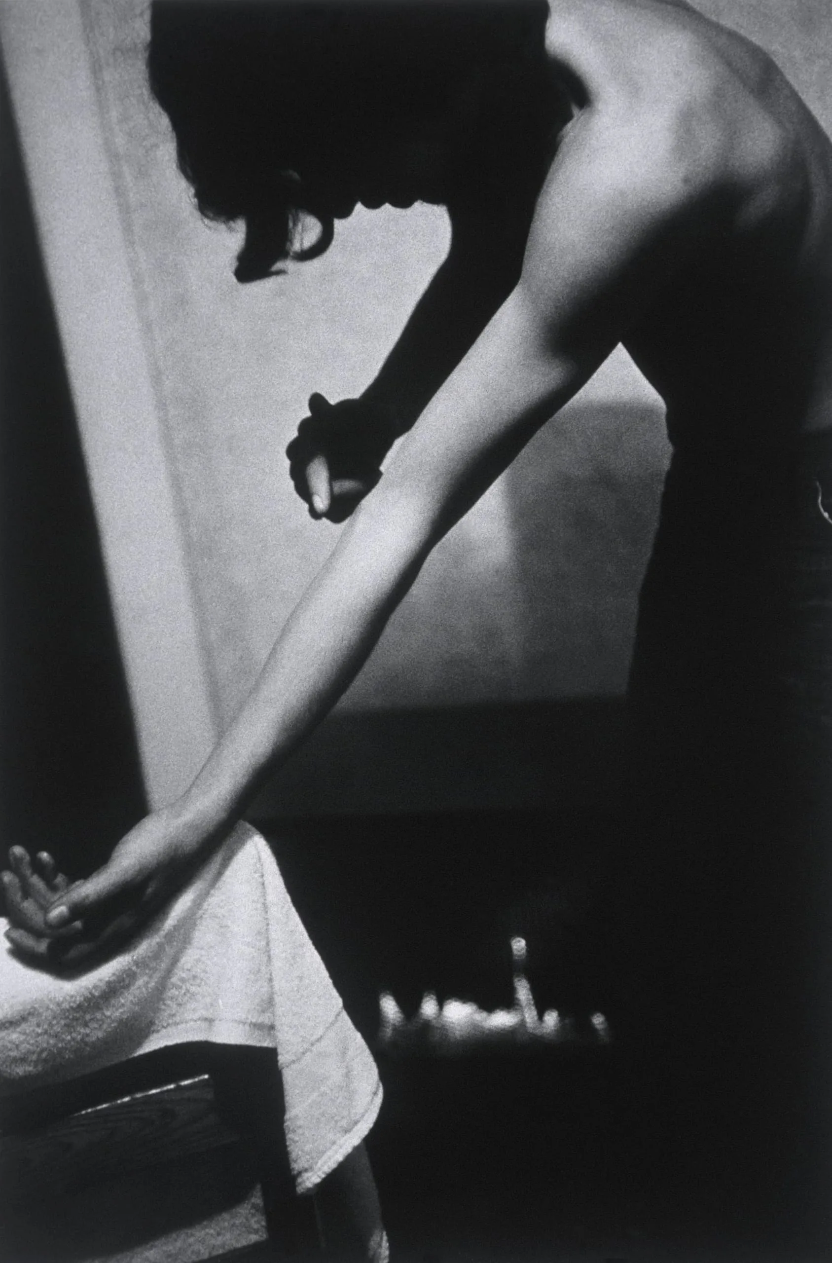 High-contrast black and white photograph of a bare arm extending diagonally from upper right to lower center, a bowed head with dark hair, and hands touching a white towel, with a blurred nighttime cityscape visible in the background