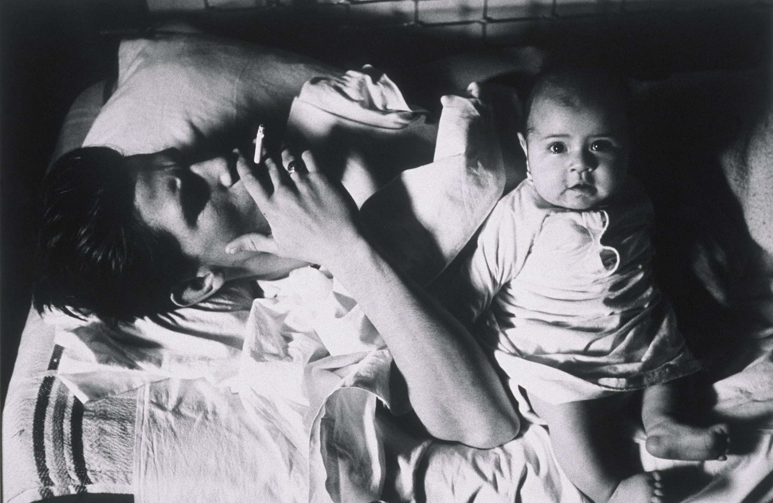 Black and white photograph, overhead view of an adult lying on rumpled white sheets holding a cigarette, a young infant lying beside them looking up at the camera