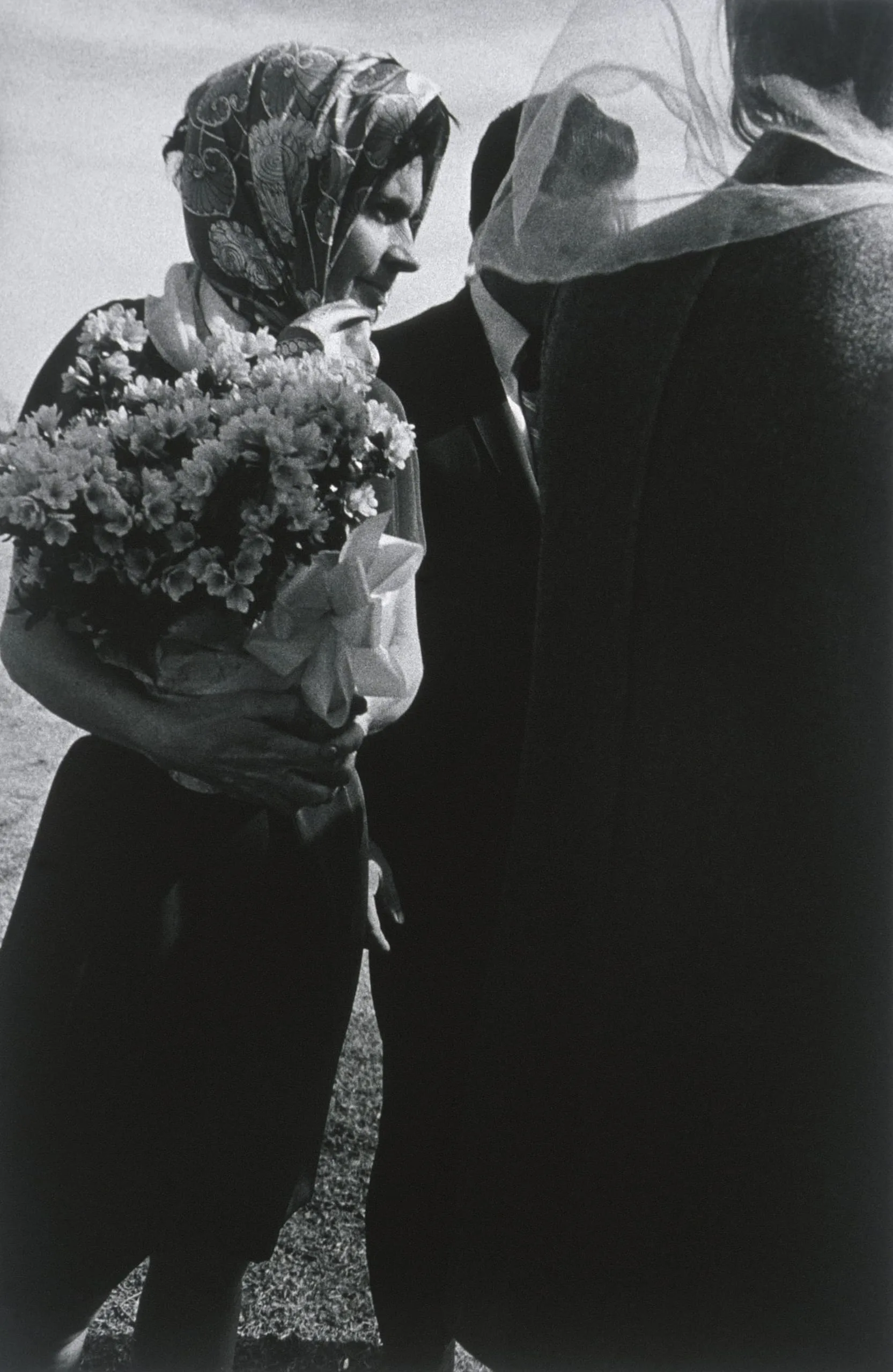 Black and white photograph of a woman in a patterned headscarf holding a large flower bouquet, flanked by two partially cropped figures, outdoors