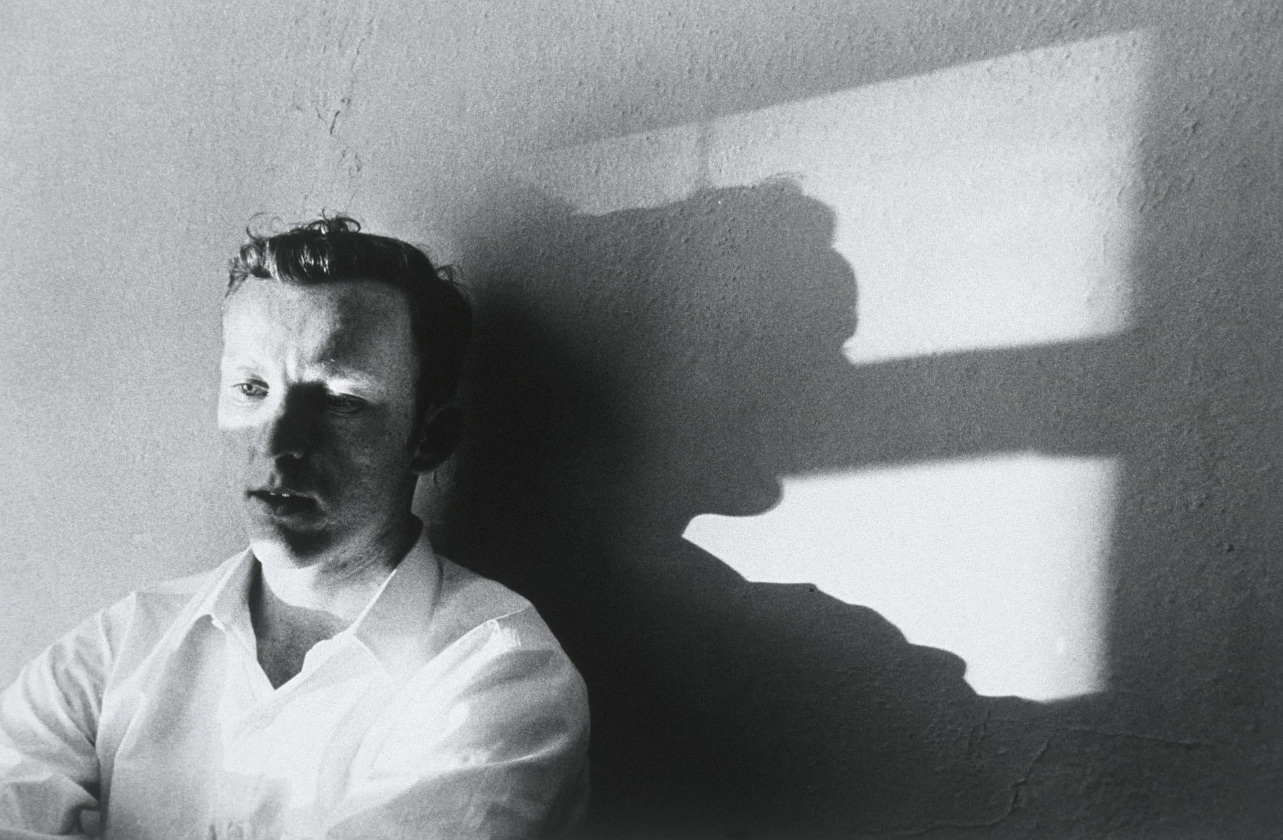 Black and white portrait photograph, a man in a white shirt looks left with dramatic side lighting, a large shadow of a hand holding a camera cast on the wall beside him