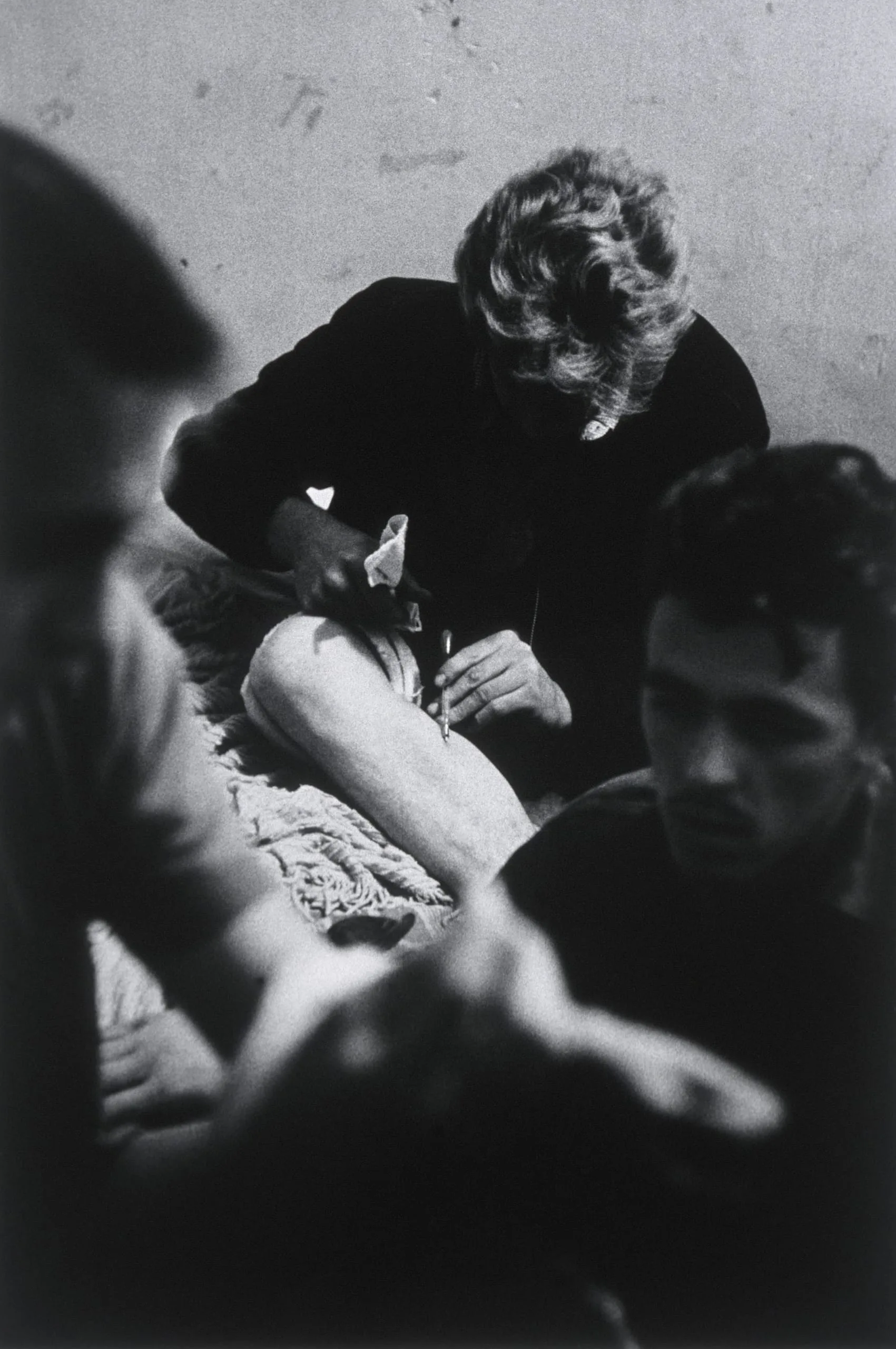 Black and white photograph, three figures gathered closely, central person with curly hair bending forward over another's bare legs, holding a small object