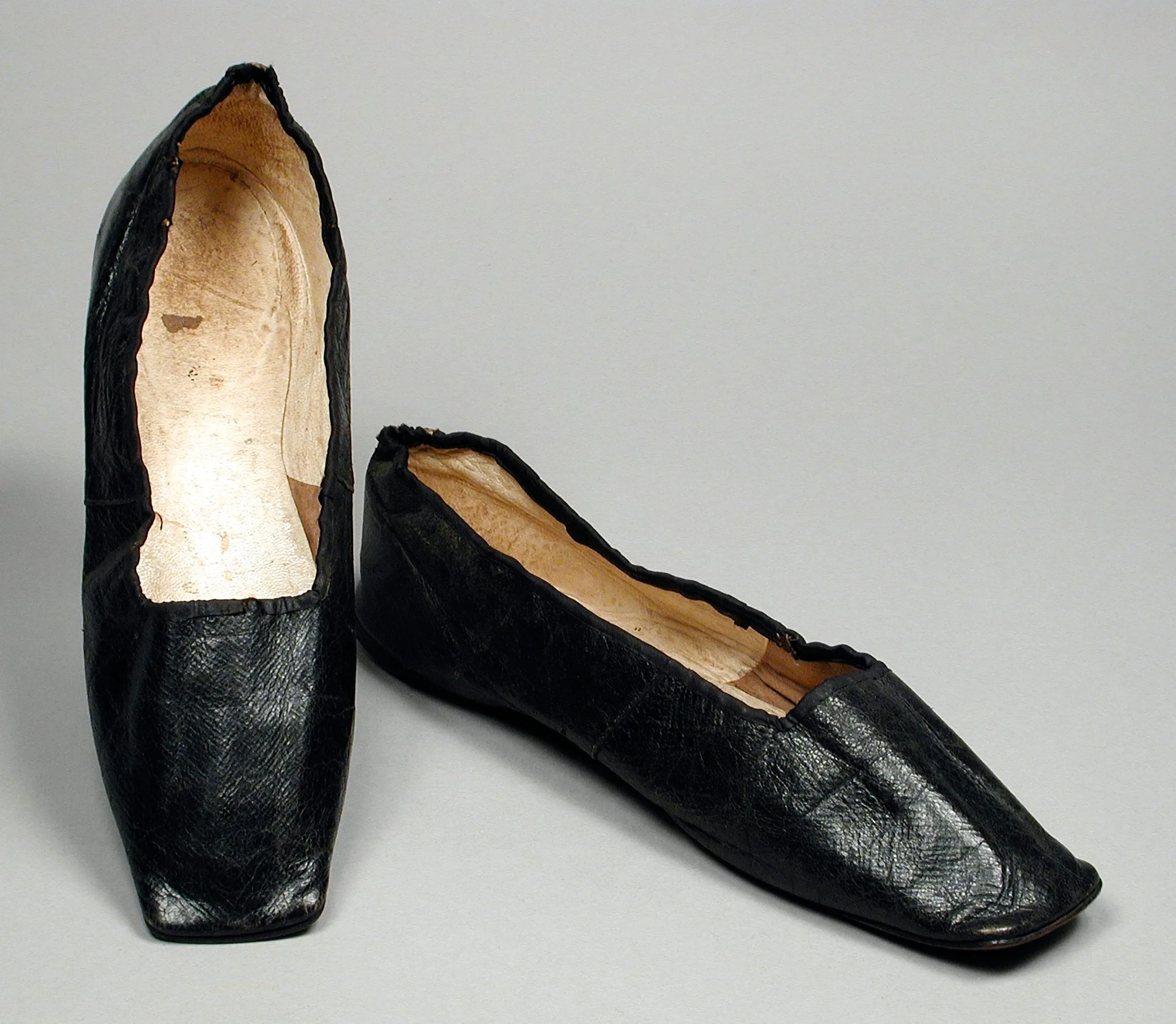 Pair of flat black leather slip-on shoes with pointed square toes, heavily creased surfaces, and cream-colored lining, displayed on a gray background