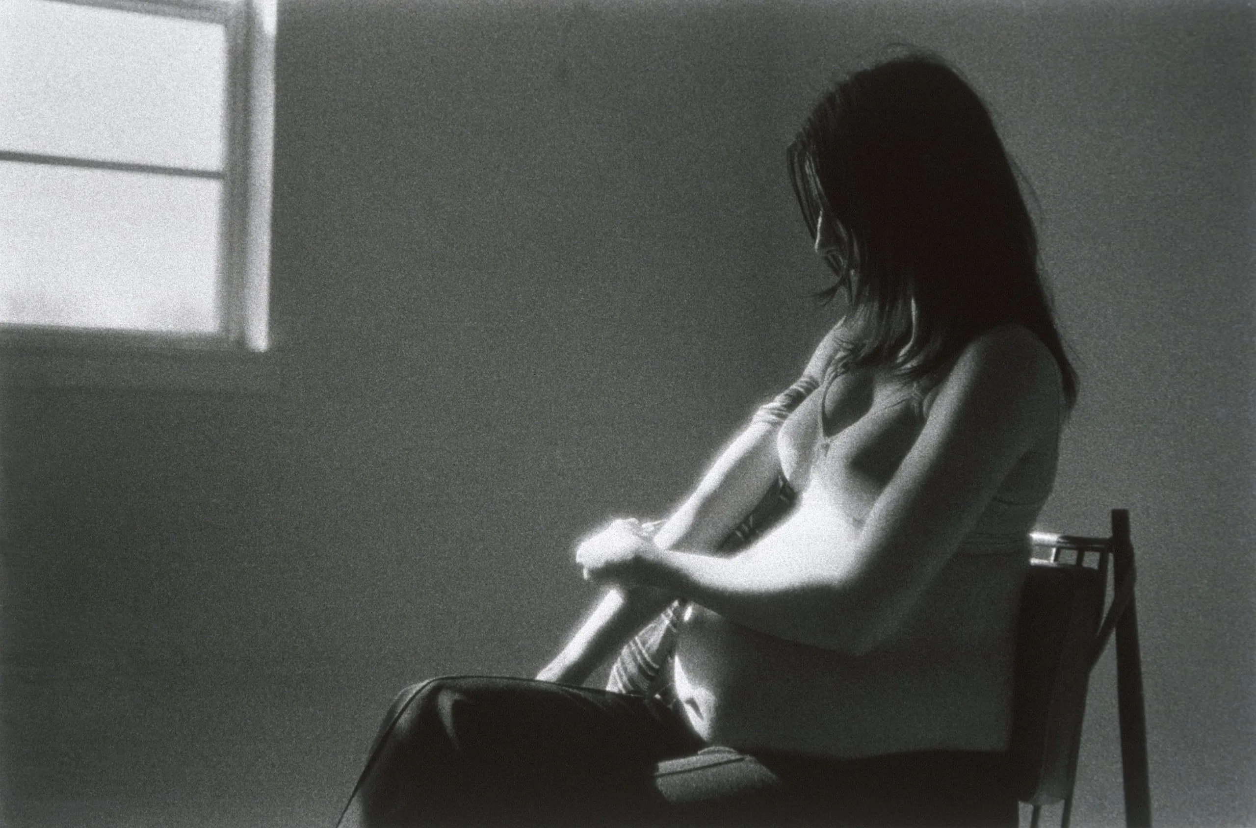 Black and white photograph of a pregnant woman seated in profile on a wooden chair, head bowed, strongly lit from a window at upper left
