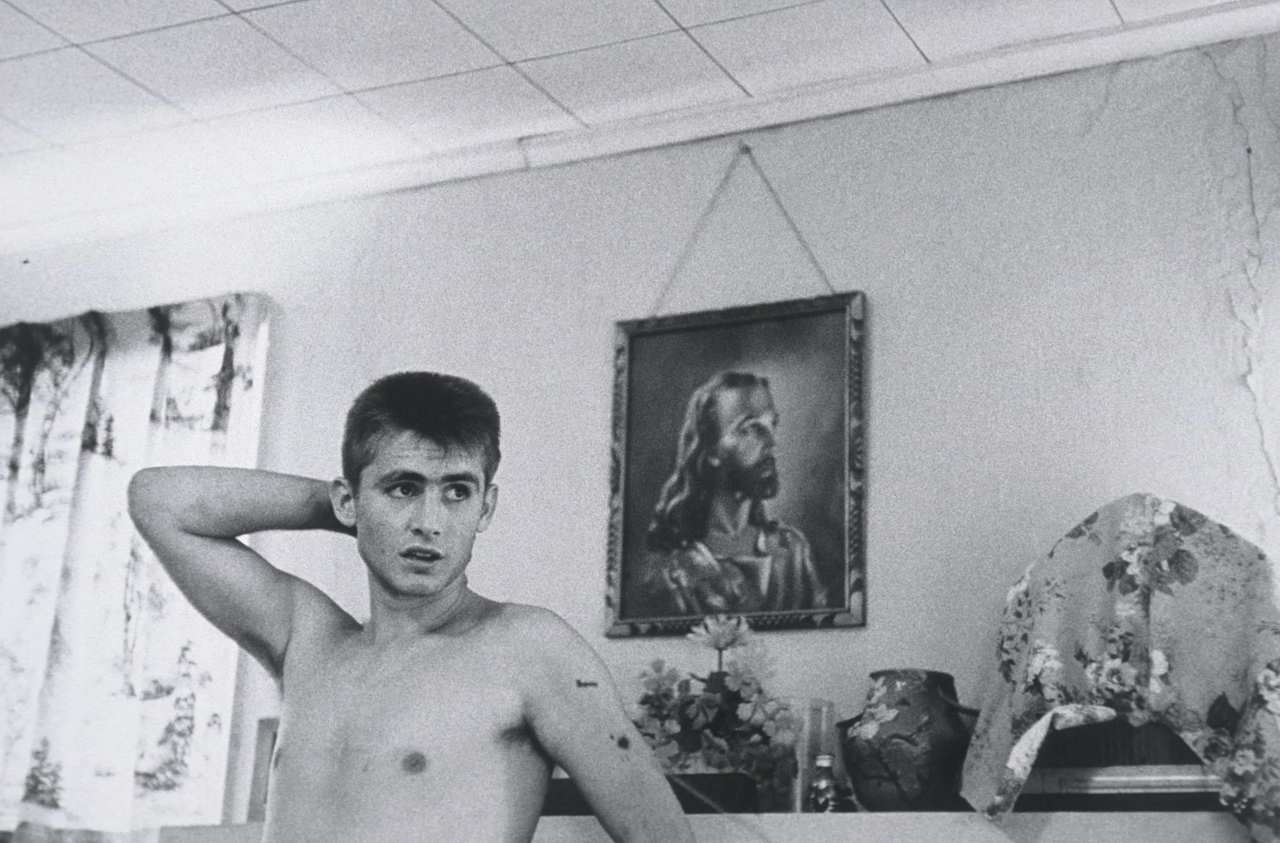 Black and white photograph of a shirtless young white man with his hand behind his head, standing in front of a wall with a framed religious portrait and floral-patterned mirror