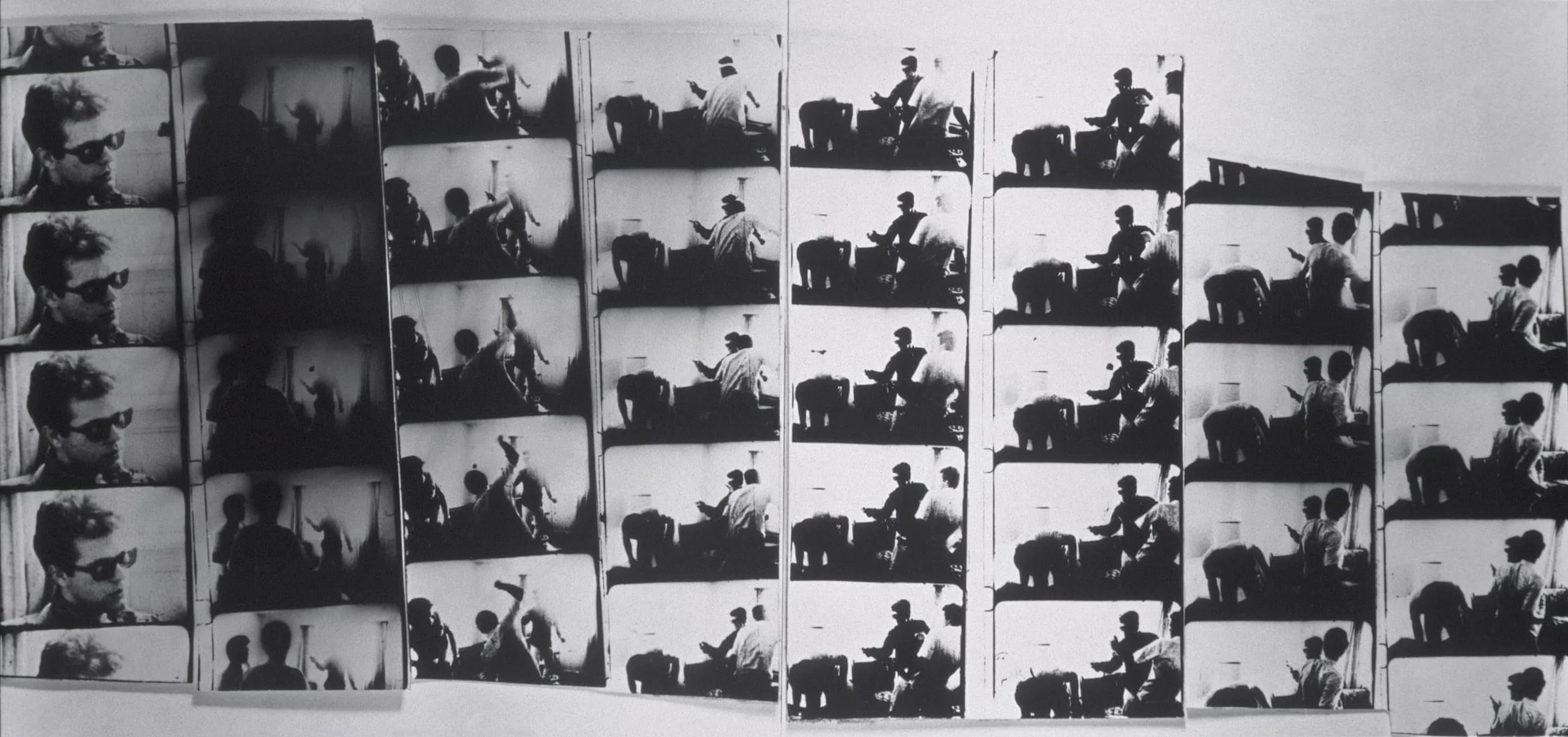 Screenprint or photo-based print with a grid of high-contrast black and white repeated frames showing close-up portraits and two seated figures, resembling a film contact sheet