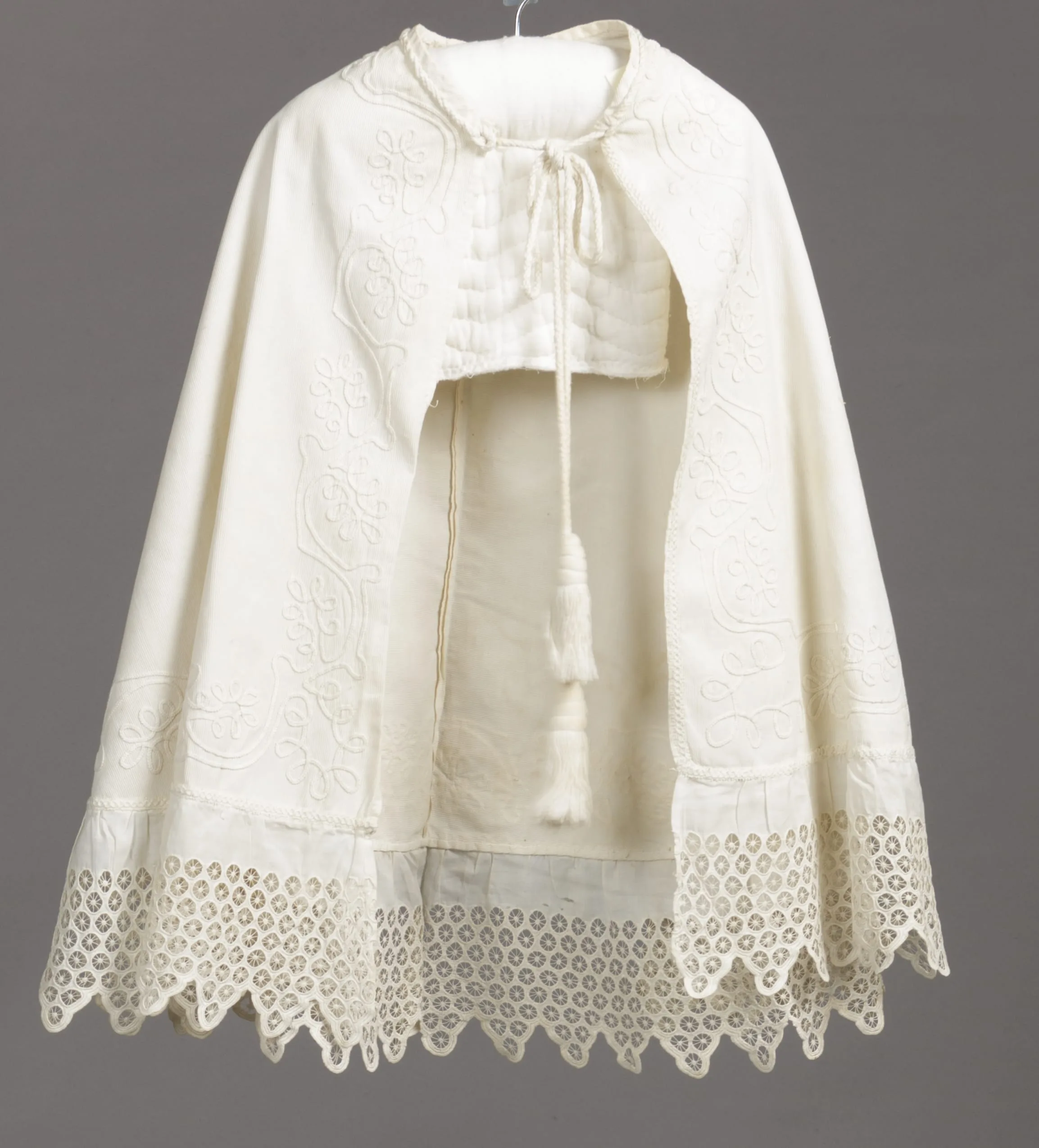 - Cotton plain weave (bedford cloth), cotton braid (soutache), cotton plain weave, cotton embroidery, and cotton braid cord with cotton tassels