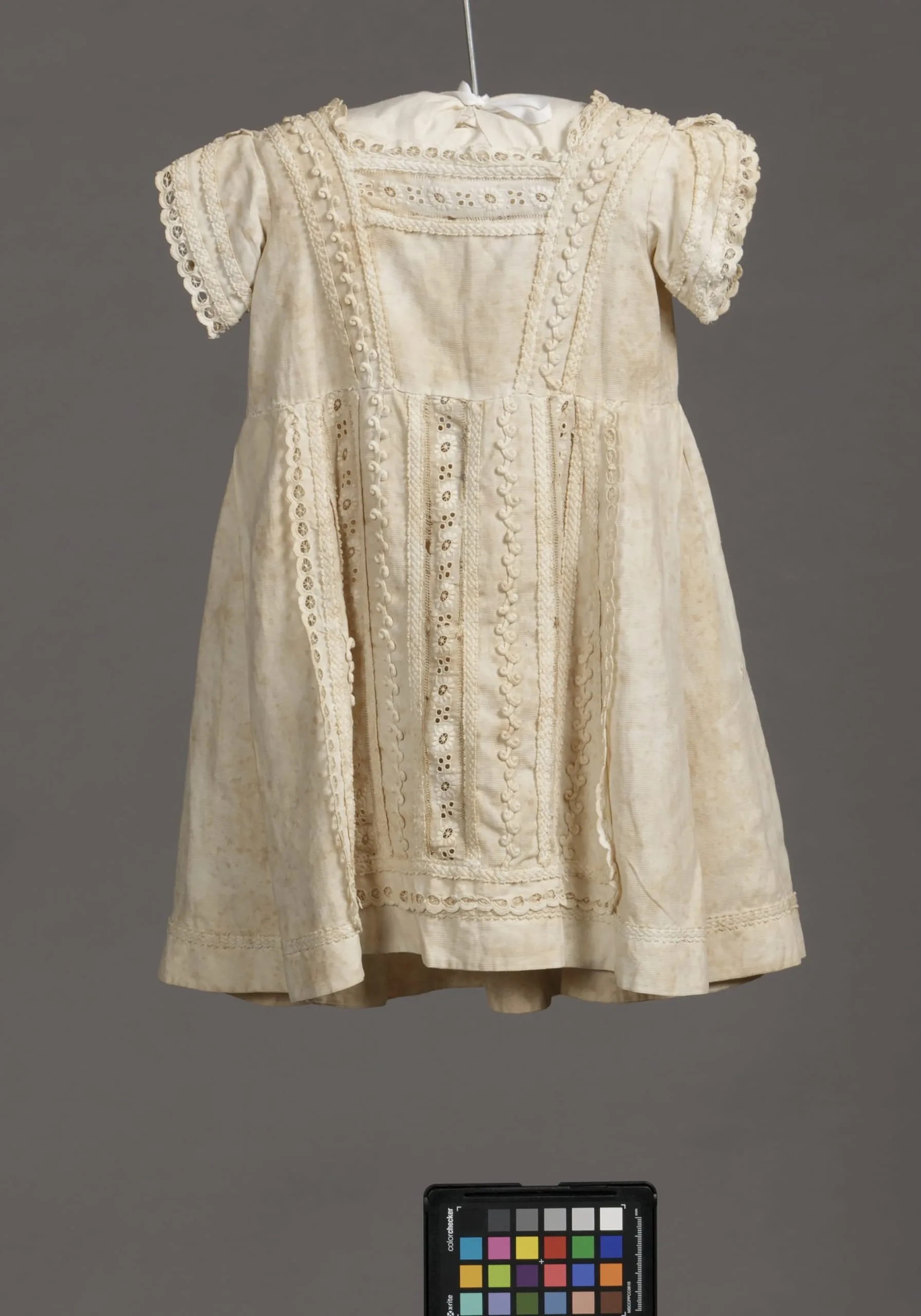 - Cotton plain weave with cotton embroidery, cotton braid (soutache) and glass buttons
