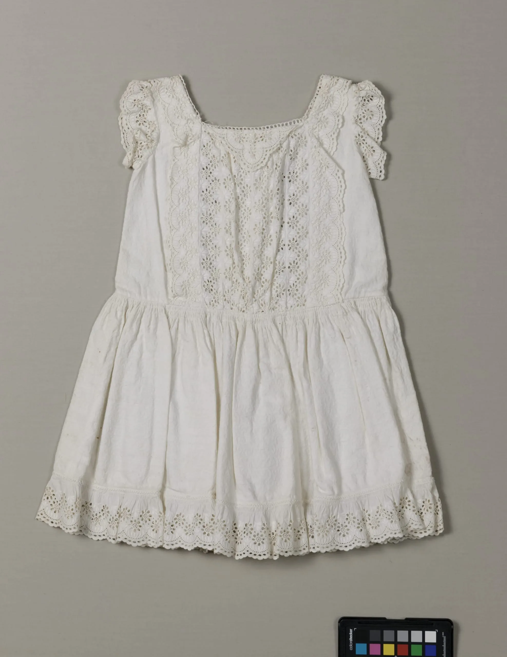 - Cotton plain weave with warp patterning and cotton cutwork embroidery (broderie anglaise)