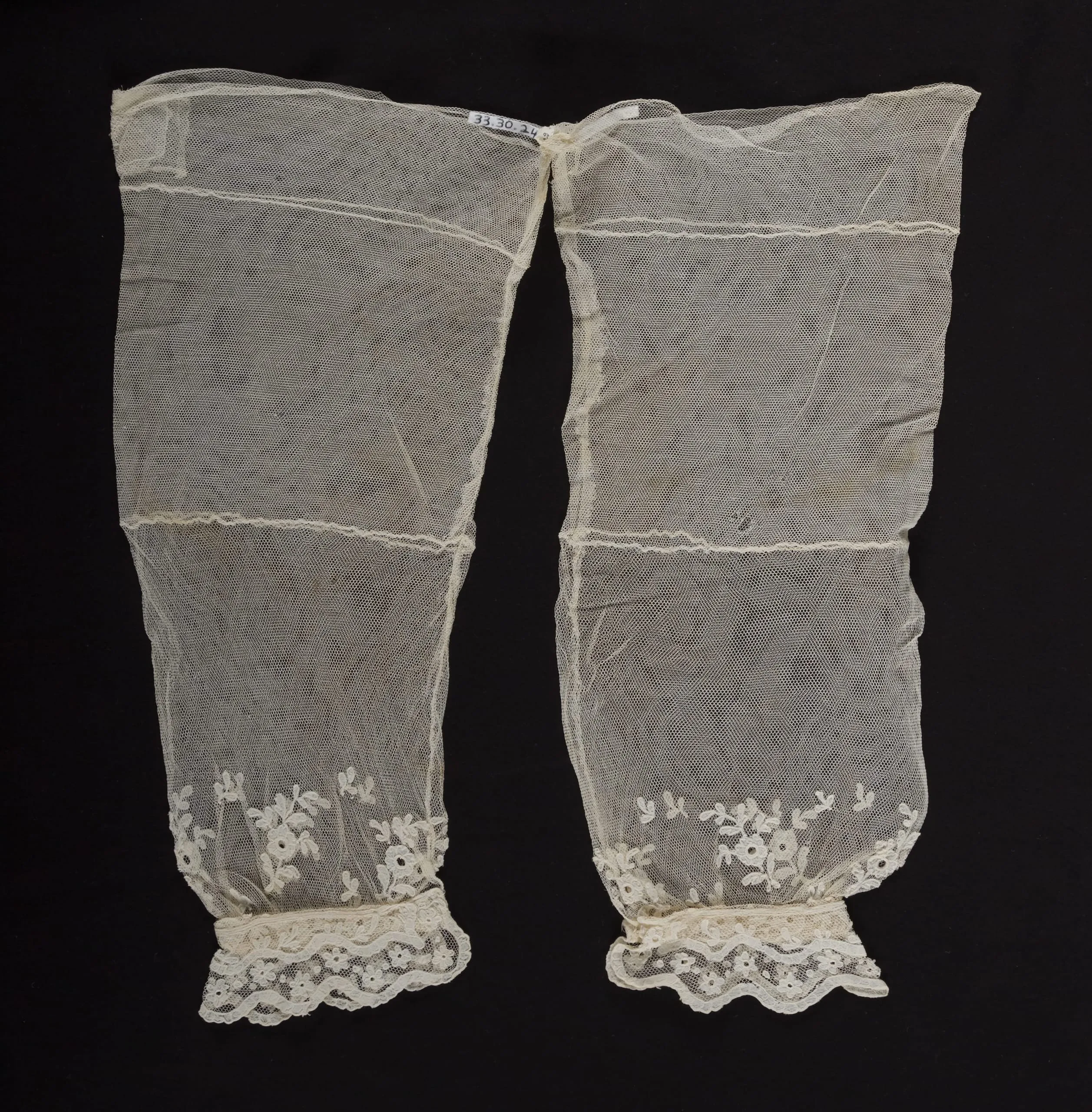 Pair of cream-colored net fabric sleeves with embroidered floral bands and scalloped lace borders at the cuffs, displayed flat against a black background