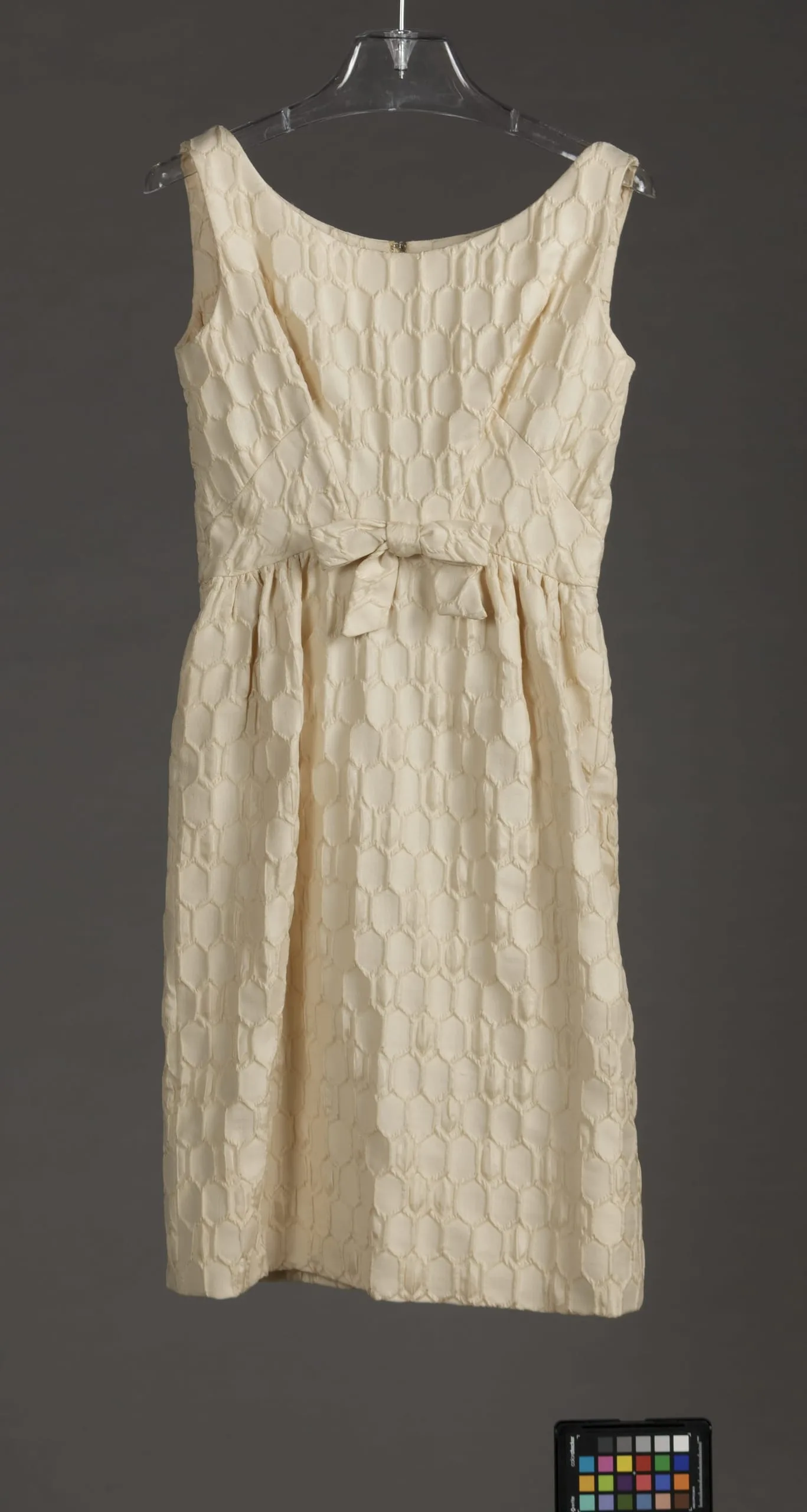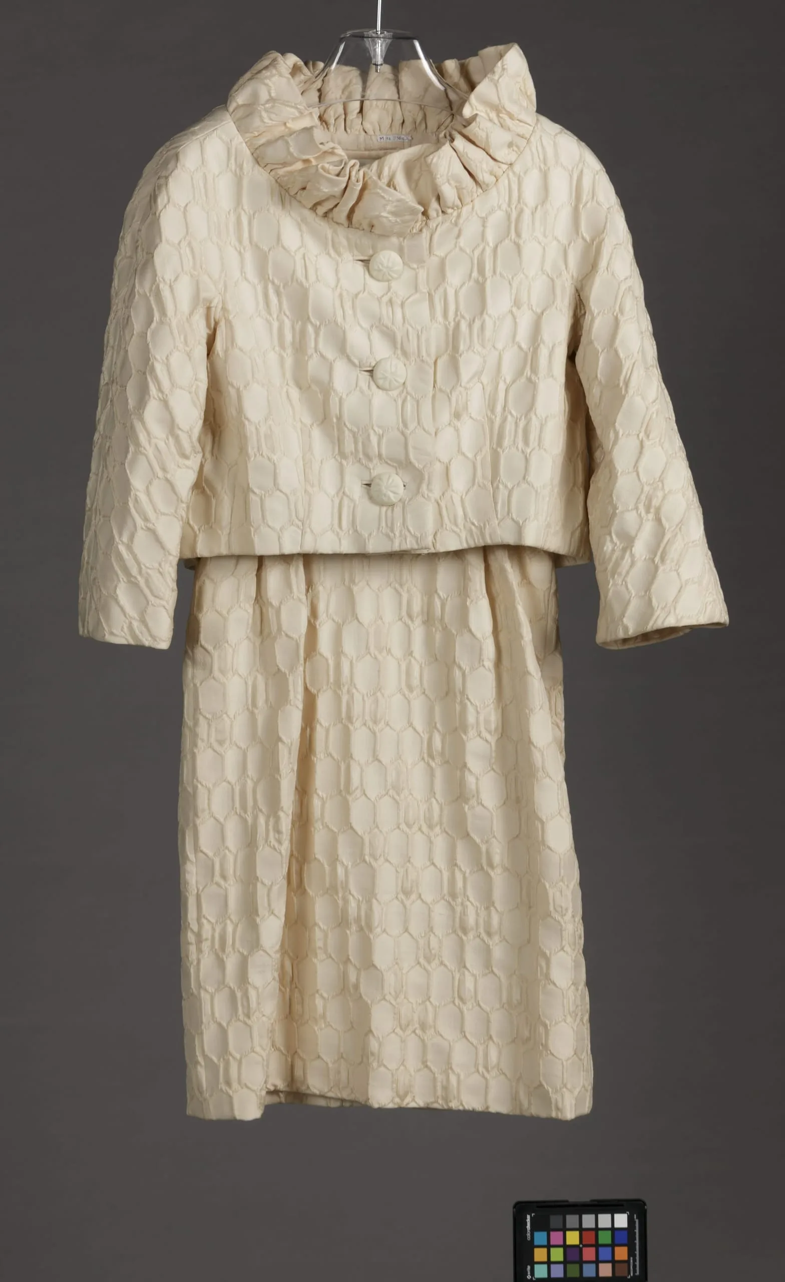 - Silk plain weave double cloth with weft patterning (matelassé) and plastic buttons