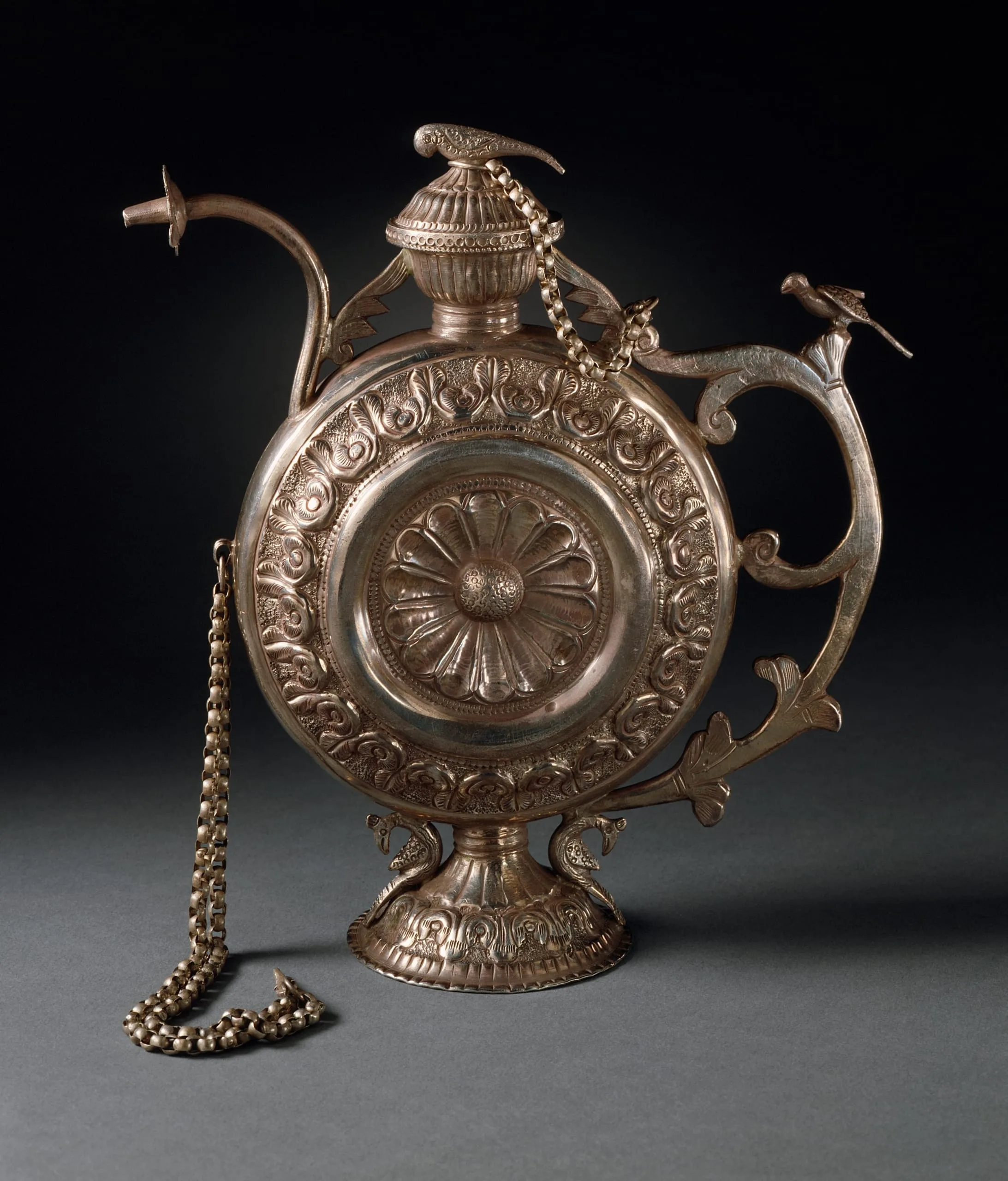 The flat circular body of this ewer has a widespread heritage. Metal and ceramic vessels of a similar round shape were used as canteens or wine flasks in the Islamic world, India, and China as early as the 12th century. Developing from those earlier traditions but influenced by Sultanate and Mughal ewer forms (see AC1995.52.1) are round beer vessels made in Tibet in the 18th and 19th centuries. Ultimately, vessels with circular bodies may derive from related leather and camel skin vessels, later examples of which survive from the 19th century. Ewers made in this distinctive form are sometimes described as a decanter (chuski).