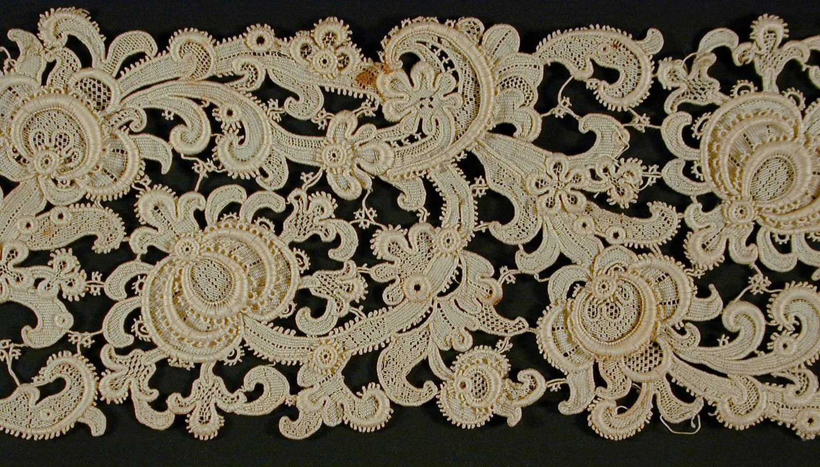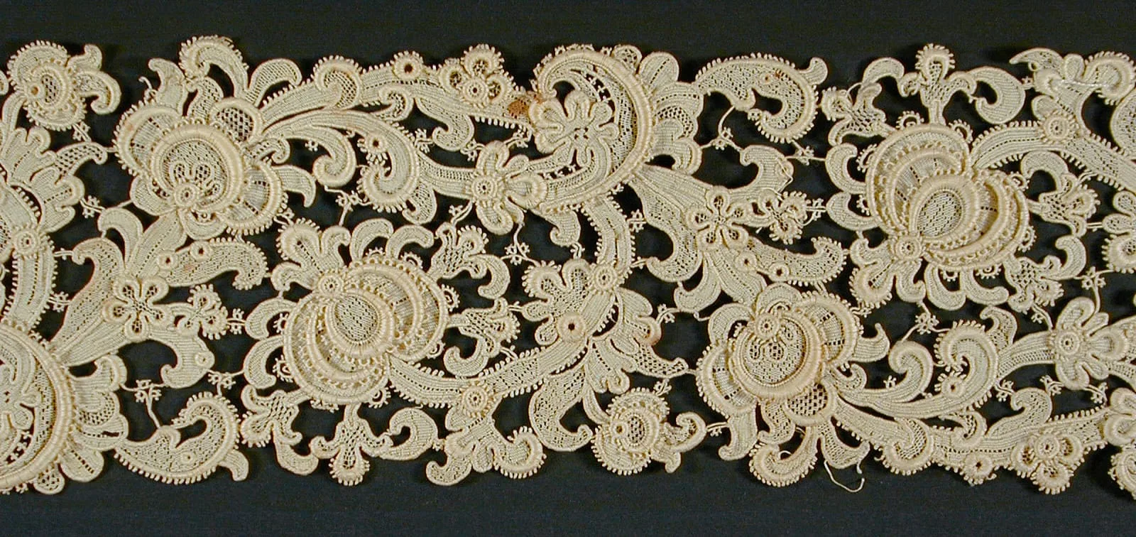 Horizontal band of cream needle lace with large circular medallions, scrolling stems, and open mesh fill, photographed flat against a black background