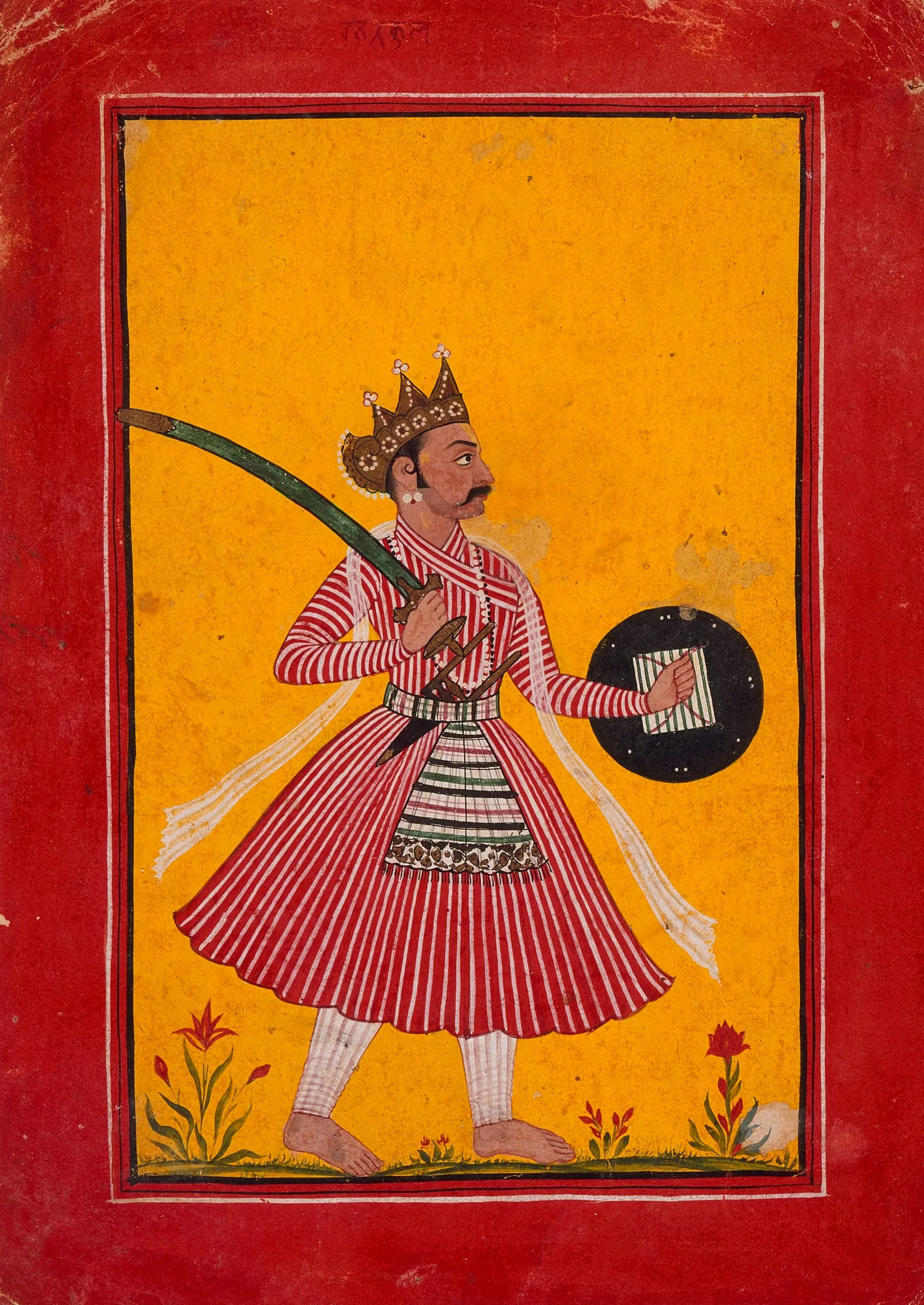 As identified by the faint devanagari inscription in the upper red border, the subject of this portrait is Raja Nakula. Since no king by that name is known from historical records, and because the figure is wearing a five-pointed crown (shown here in profile) that is associated with Krishna and other Vaishnava deities rather than a turban normally worn by Pahari monarchs, it has been suggested that this is a dream portrait of Nakula, the fourth of the five heroic Pandava brothers of the epic Mahabharata ([War of the] Great Bharatas). Nakula, the twin of Sahadeva, was skilled at swordsmanship and, accordingly, is shown here brandishing a sword. Nakula's older brother, the legendarily powerful Bhima, is also sometimes represented in series of dream portraits, which were used by astrologers for divination purposes. For example, see a Bhima portrait in a closely related dream series attributed to Nurpur, Himachal Pradesh (?), circa 1700, in the Museum of Fine Arts, Boston (17.2770). For a Mankot dream portrait of Nakula’s father Raja Pandu and his stepmother Kunti, see M.69.13.6.