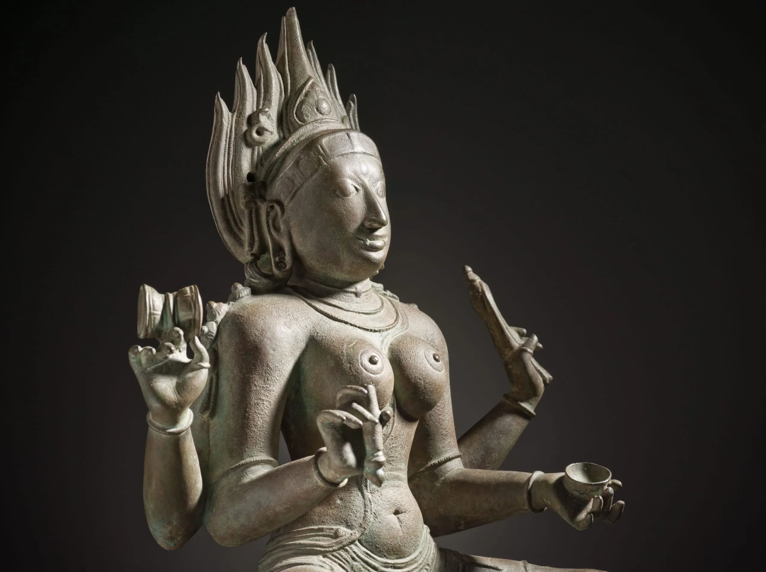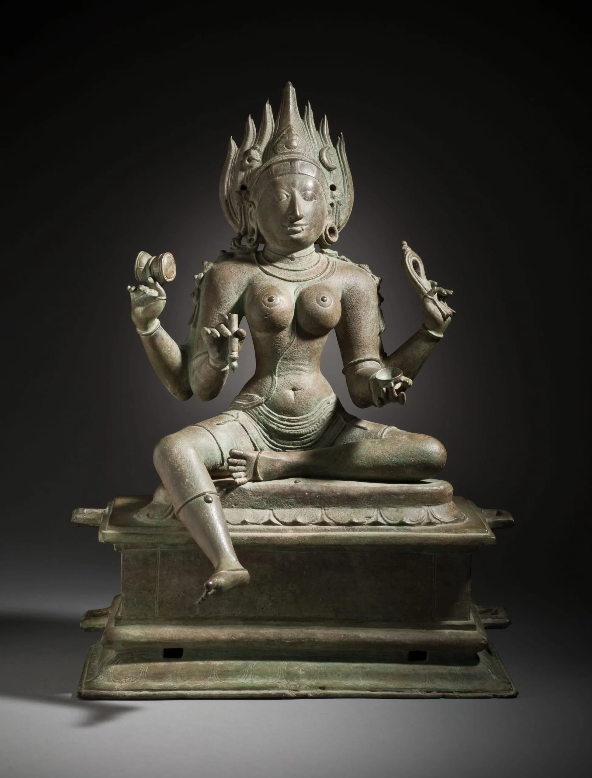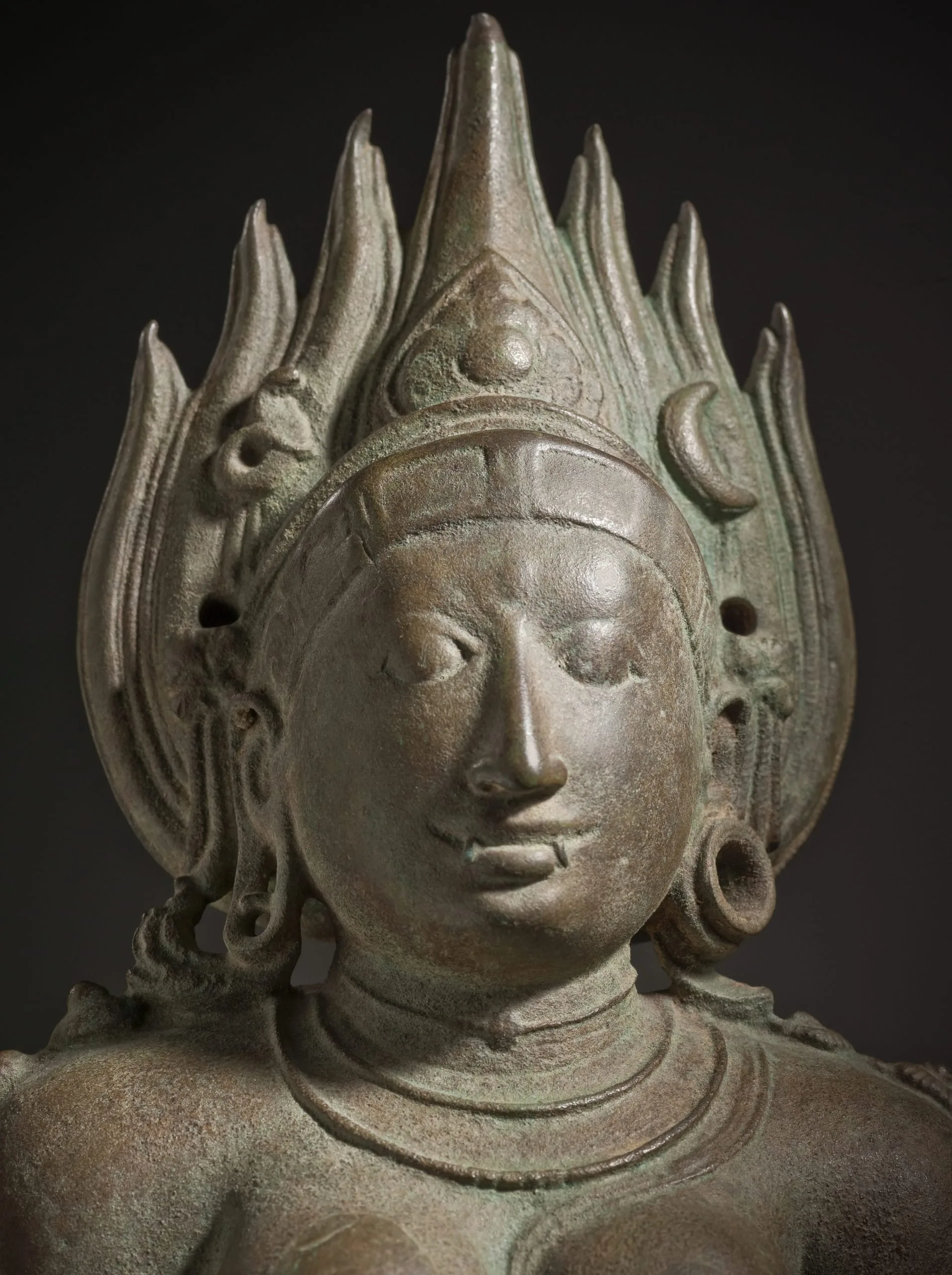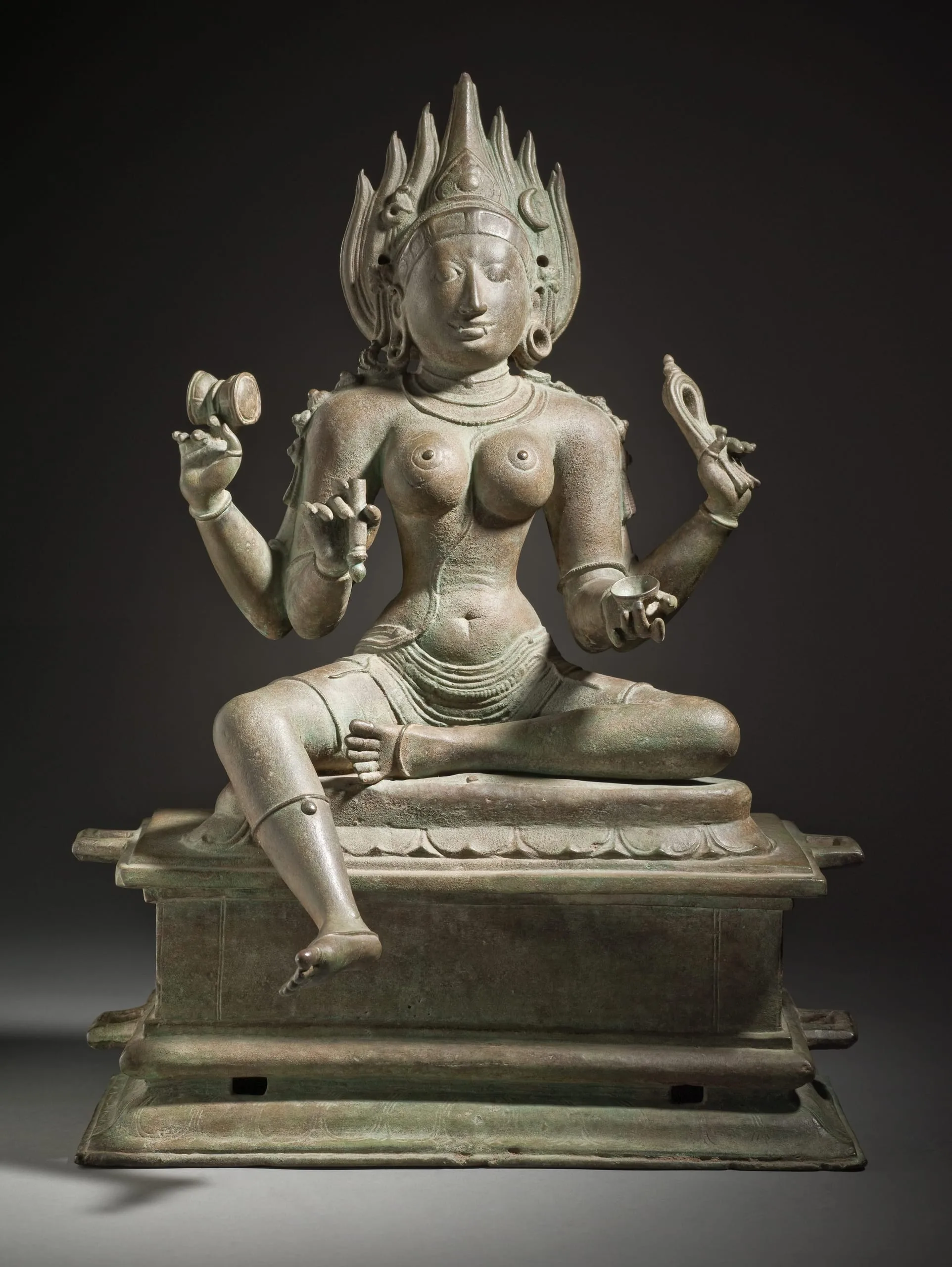 In north India, Kali is typically depicted with a garland of skulls, snakes, sword, lolling tongue dripping blood, and tiger skin skirt. Here, however, in accordance with a south Indian iconographic tradition, she is depicted in a more pacific form in the guise of a beautiful woman with her only fierce attributes being fangs and flaming hair that forms a nimbus. Small holes in her hair above her ears suggest she may have once had separate earrings attached. She has a third eye in her forehead and her hair is adorned with a serpent and crescent moon, all of which are attributes associated with the god Shiva. She wears heavy earrings, one of which is in the form of a mythical aquatic creature (makara kundala). She sits on a double lotus base in a relaxed posture (lalita asana) with her right leg pendant. The goddesses four arms. In her upper right hand, she holds a drum. Her lower right hand carries a now-broken trident. In her upper left hand, she holds a noose. Her lower left hand carries a skull cup. The presence of lugs on the side of the tiered pedestal indicates the bronze originally had a large aureole (prabhavali). The two holes above the lotus border of the pedestal were used to tie the bronze onto poles for parading during festival processions.