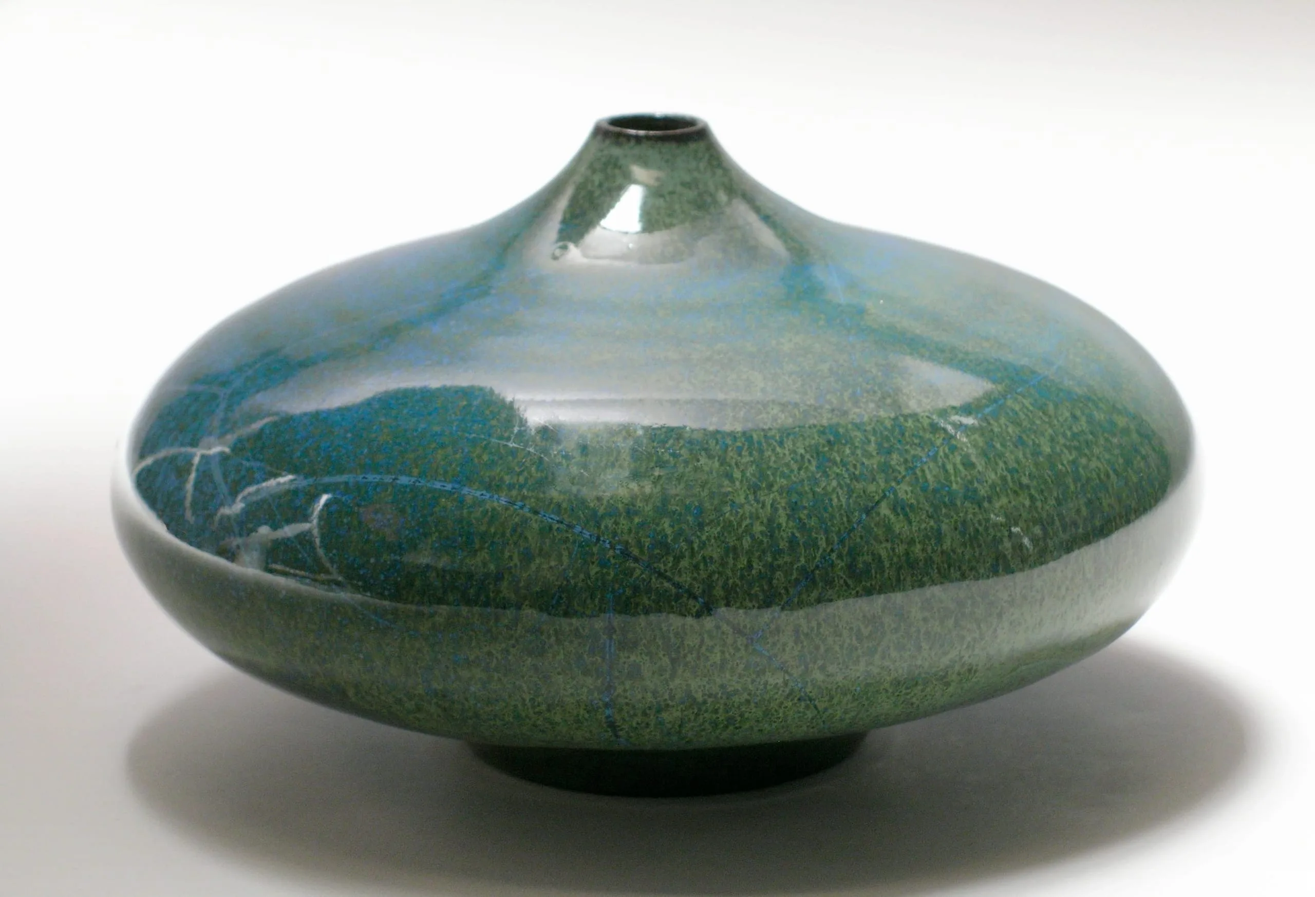 Ceramic vessel with a wide, flattened spherical body and tiny mouth, covered in a glossy glaze with bands of mottled green, periwinkle blue, and branching white lines