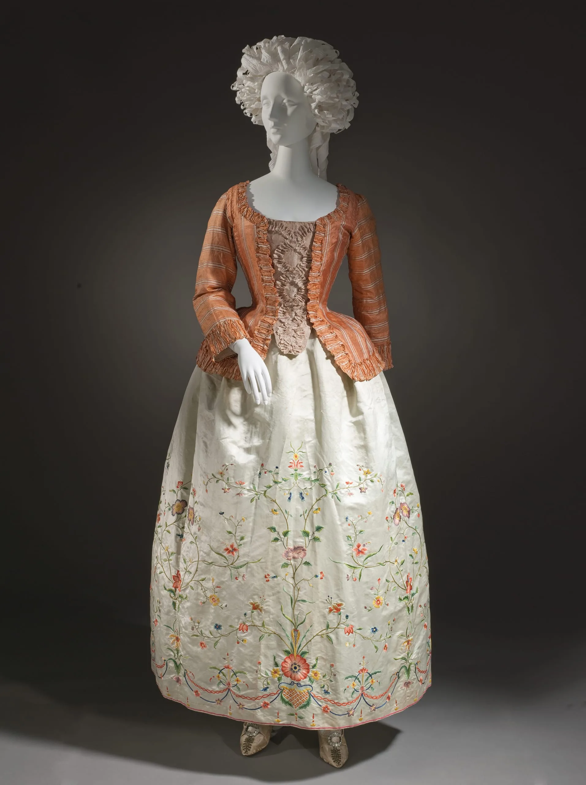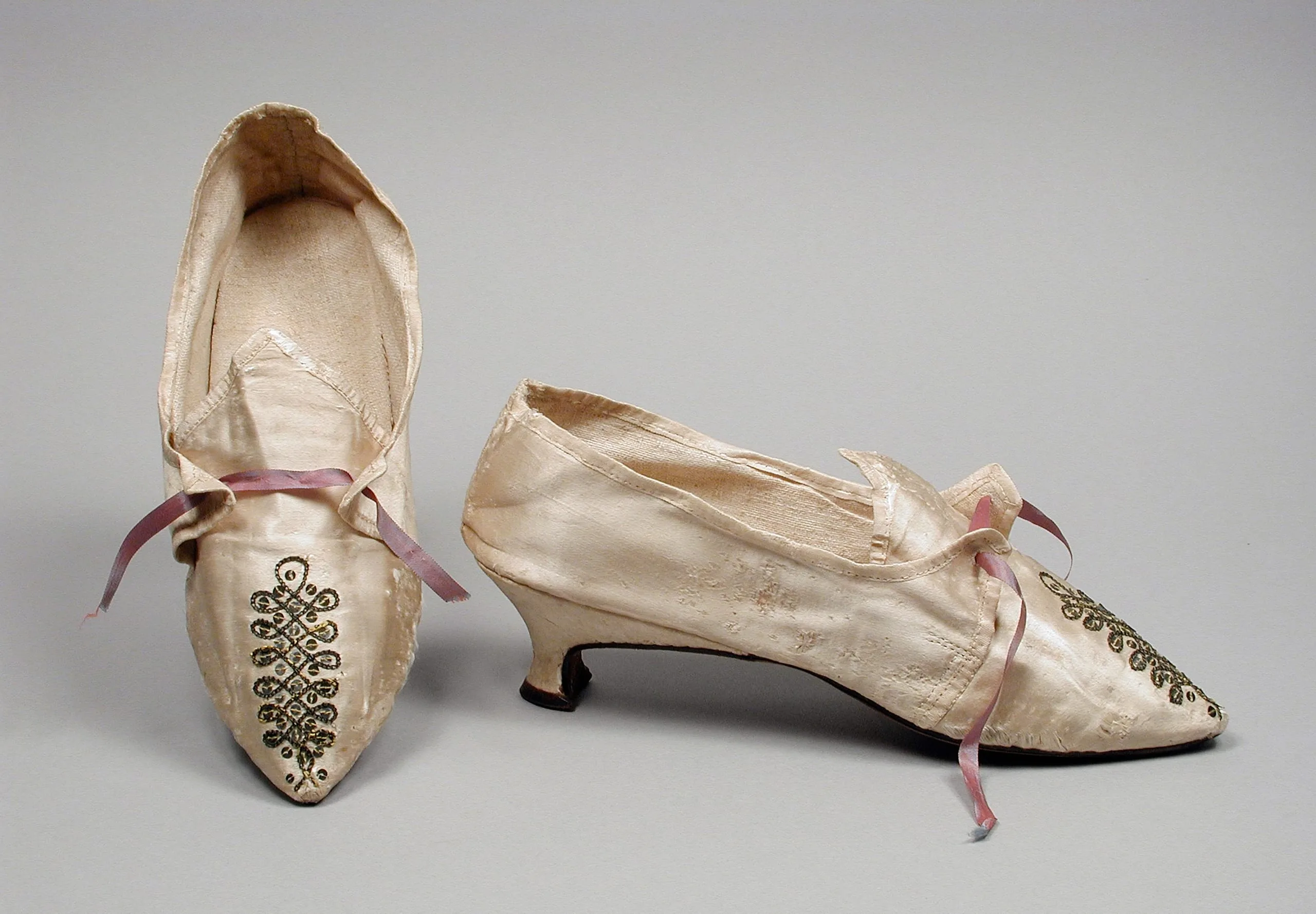 - Silk satin with sequins and metallic-thread embroidery, and leather