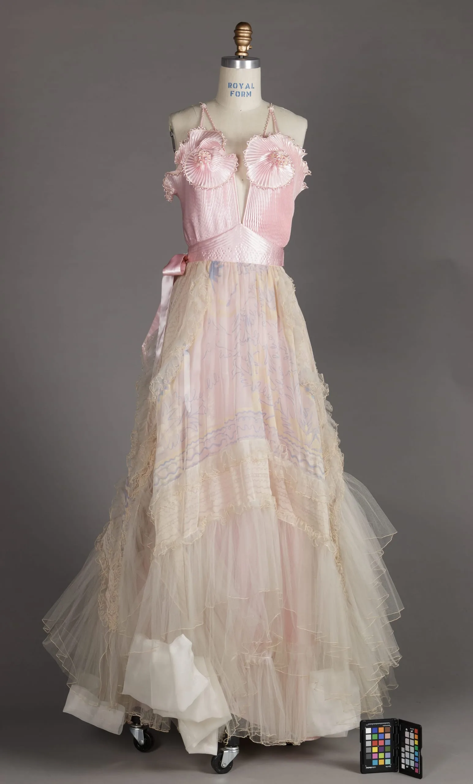 - Dress: silk plain weave, pleated, silk plain weave (chiffon), silk net, and synthetic satin, with glass beads.