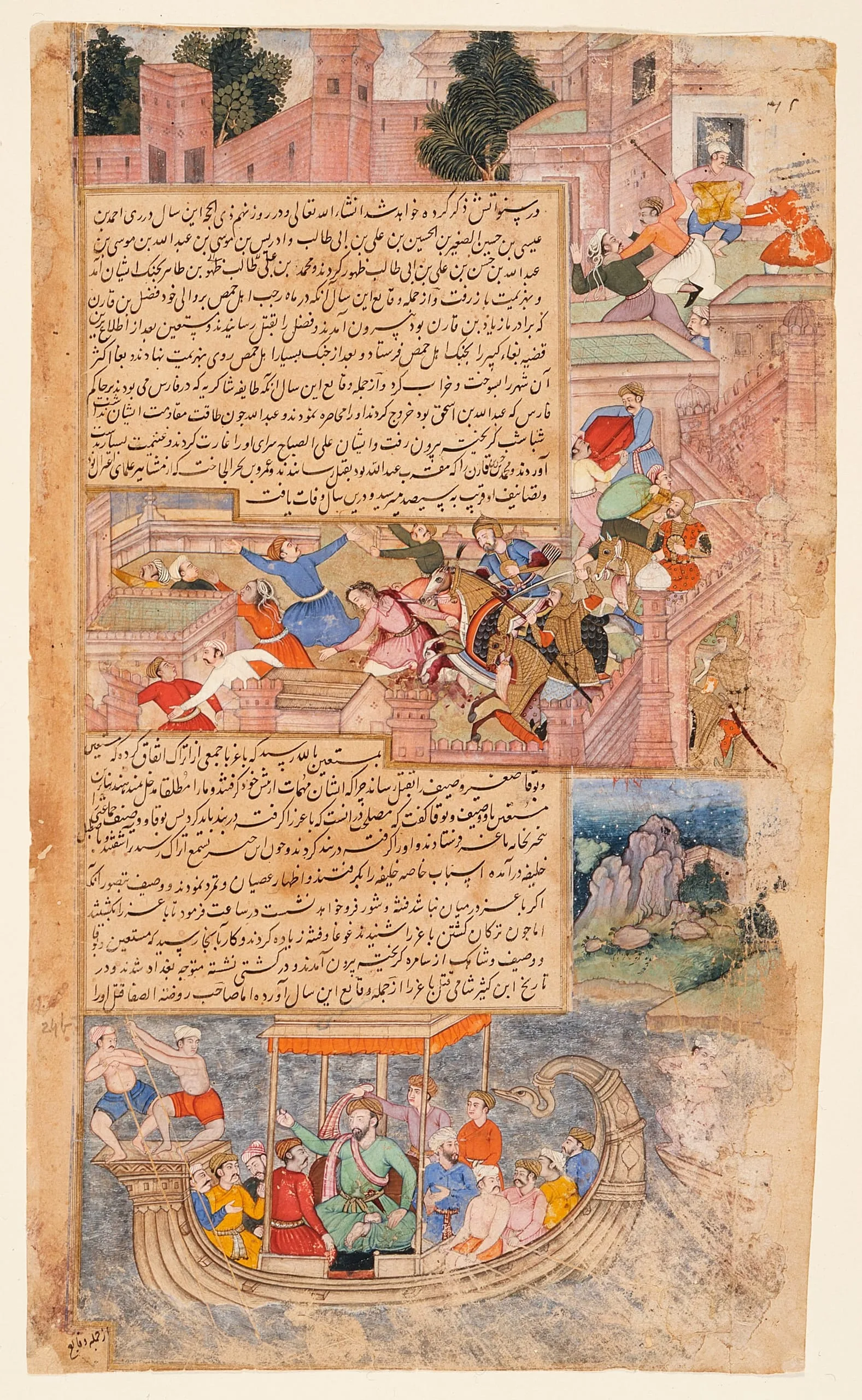 This folio, which has illuminations and text on the recto and text only on the verso, portrays the people of the military district of Hams (or Homs) in Syria ransacking the palace of Governor Fazal. The Abbasid Caliph Mustain (r. 862-866) sent an army in a naval expedition to suppress the revolt. The Caliph’s army is shown attacking the rioters who had breached the palace. The larger central figure in the boat at the bottom likely represents the Caliph himself.