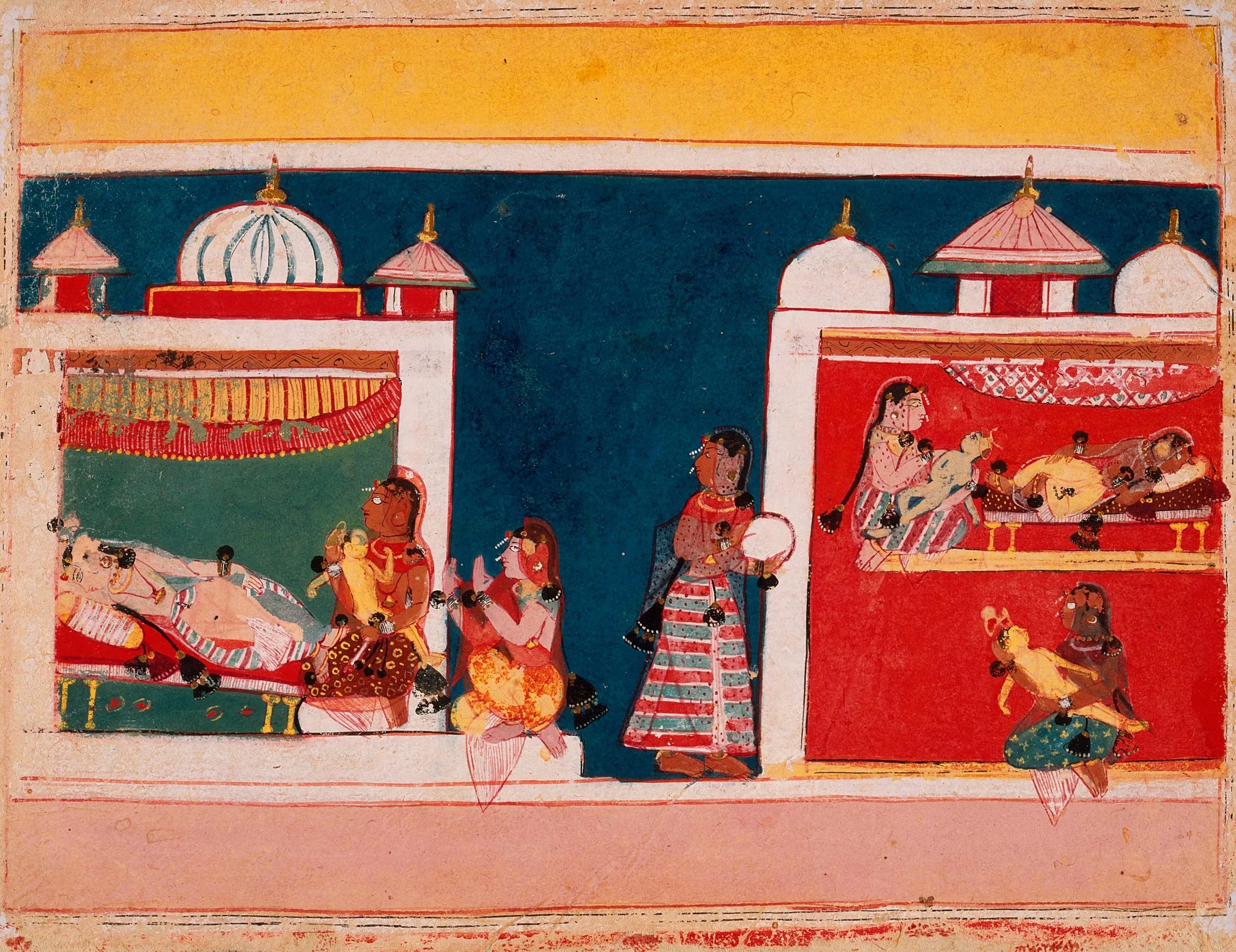 According to the inscribed labels on the reverse, this illustration from Book 1 (Bala kanda) depicts the birth of Rama’s younger brothers, Bharata, Lakshmana, and Shatrughna (Ramayana 1:17:7-9). In the pavilion on the left, Kaikeyi gives birth to Bharata. In the pavilion on the right, Sumitra gives birth to Lakshmana, and Shatrughna. Maidservants are in attendance.