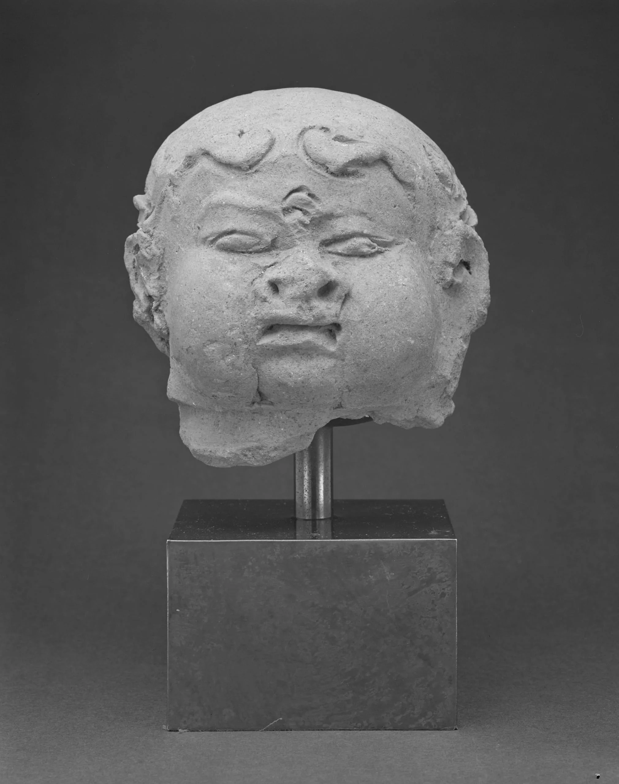 This head of a gluttonous boy has slit on the crown of his head for inserting the coins. Like the plump piggy banks, his rotund features may be a pun on his function as a greedy receptacle. See Robert L. Brown, "The Art of Southeast Asia," Arts of Asia 15:6 (November-December 1985), pp. 123 and 125, fig. 89.