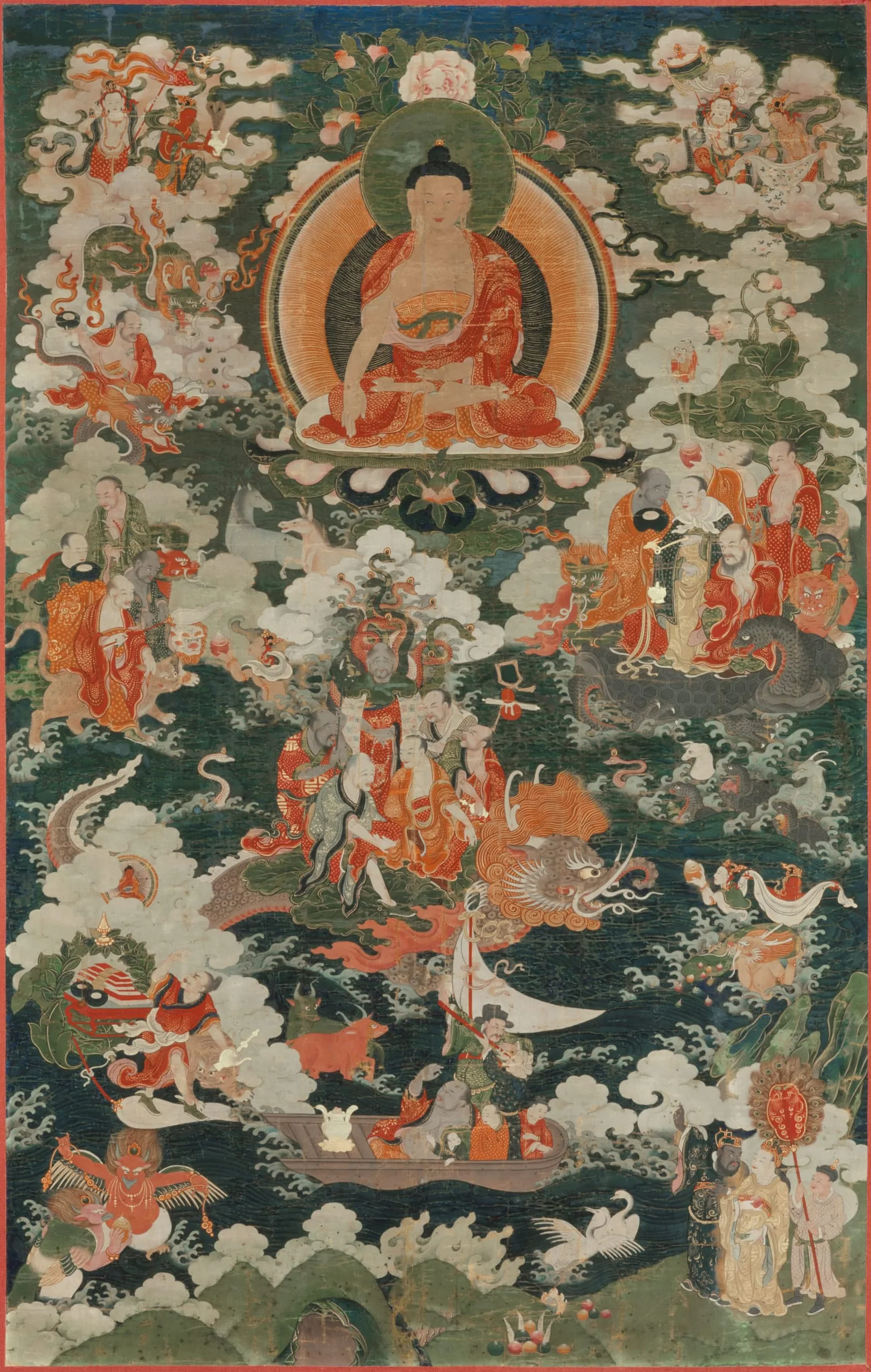 This richly detailed painting from Kham in Eastern Tibetan depicts the historical Buddha Shakyamuni in the upper center seated in the meditation posture (padma asana) on a lotus base with his hand extended in the gesture of Turning the Wheel of the Law (dharmachakra mudra or dharmachakra-pravartana mudra). He is floating in the heavens above an ocean filled with auspicious figures and personages, principally the Sixteen Great Arhats (Buddhist saints) or Elders (sthaviras). There are three columns of figural groups. On the left from top to bottom are a white-skinned god holding a standard with a mythical aquatic creature banner (makara dhvaja) and a red-skinned goddess holding a Vase of Immortality (tshe-bum) with peacock feathers (see M.83.2.1); one arhat with a makara and dragon; four arhats with a dragon, snow lion and snow leopard; the lay attendant Dharmatala or Dharmata with a tiger and an ewer (see M.84.227.2), and beside a shrine and image in the clouds of the red-skinned Jina Buddha Amitabha with his hands held in the meditation gesture (dhyana mudra). Beneath him are two half-avian, half-human Garudas holding a jewel or chain of jewels. In the center column below the Buddha are six arhats riding a makara; sea cows; and the Chinese patron Hva Shang riding in a boat with the children he protects. Hva Shang had been a monk who fled China after offending the Ming Dynasty Emperor. In the right-hand column are a white-skinned god holding an honorific parasol and a peach-skinned goddess emptying a white silk cloth of flowers symbolizing the auspicious of the event. Beneath them are five arhats standing on a reptilian tortoise and with a snow lion. Underneath them are a half-human serpent (naga) bearing jewels and two celestials holding a jewel and a white silk cloth symbolic of pacification. In the lower right corner standing on the shore is the Chinese Ming Emperor attired in an elegant robe. Beside him a dark-skinned courtier points to the miraculous appearance of the Great Arhats emerging from the sea. An attendant behind the emperor holds an honorific peacock fan over his head. In the middle of the shoreline are heaps of flaming jewels and white unicorn or rhinoceros horns. In the bottom center is an empty cave. Missing from standard representations of Shakyamuni and Sixteen Great Arhats are the Buddha’s two foremost disciples, Shariputra and Maudgalyayana, and the Four Guardians of the Directions (dikpalas), Vaishravana, Virupaksha, Dritarashtra and Virudhaka. See also M.77.155.1, M.77.155.3, and M.83.2.1a-b.;