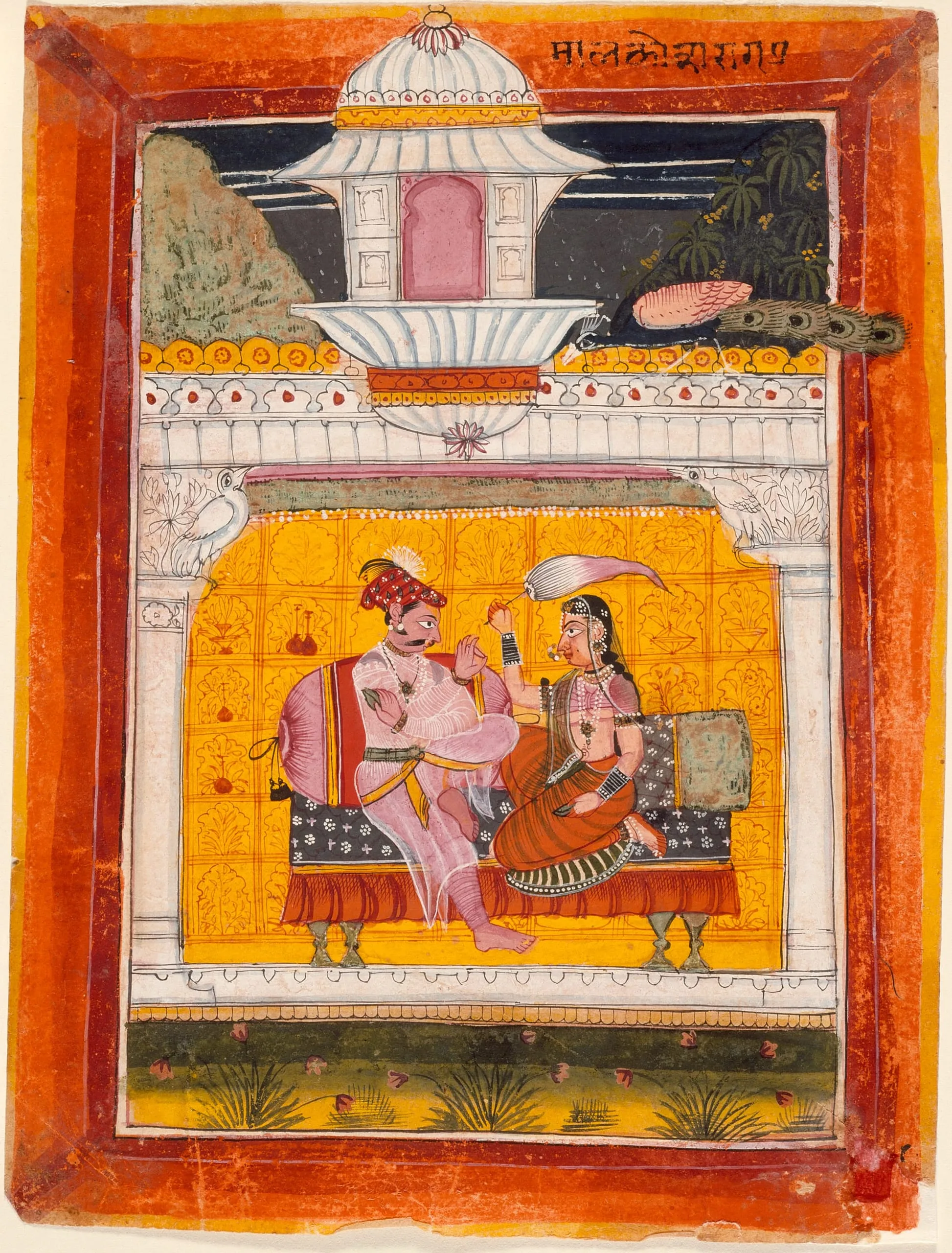 The devanagari inscription in the header identifies the melody as Malkos Raga and as number seven in the ragamala (garland of melodies) series, which is Malkos Raga’s sequence in the variant ragamala classification system followed in the princely state of Sirohi, Rajasthan. It is a sublime melody associated with midnight and late Winter (December–January). It is personified as a prince seated in a pavilion attended by a woman or women bearing an honorific fly whisk made from the white tail-hairs of a yak (cauri or chowri), symbolic of royalty. See also M.71.1.22.