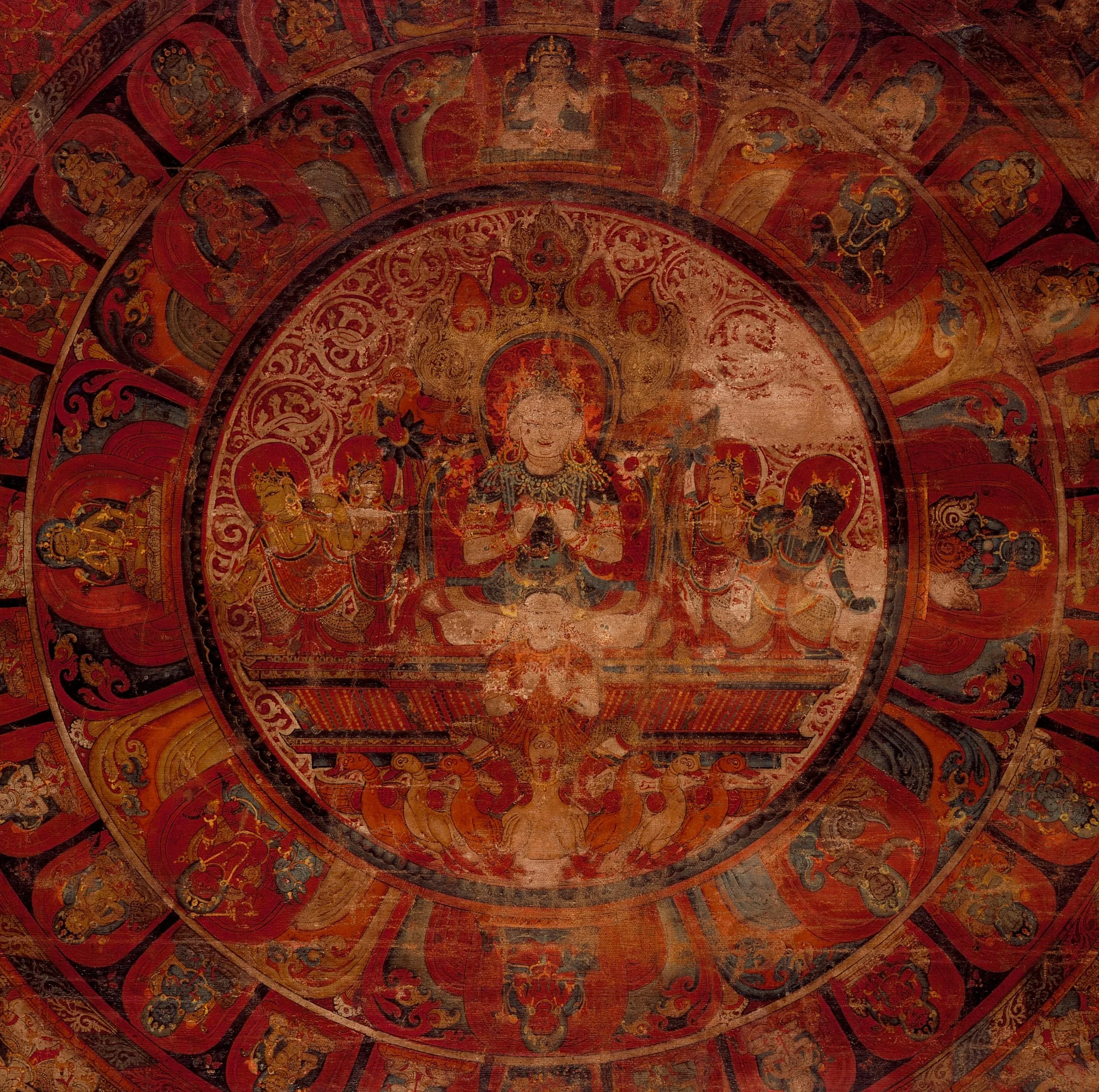 This Buddhist astrological mandala, a symbolic diagrammatic aid to meditation, was commissioned to commemorate a ceremony propitiating the moon god, Chandra, who is the white figure wearing a blue jacket in the center. Chandra rides in a chariot flanked by his two wives, Sobha and Kanti, and two archers, Sandhya and Godhuli, symbolizing dusk and twilight respectively, who are dispelling the demons of darkness. The god of the sky, Ambara, is the charioteer guiding the chariot’s flight through the night sky. Seven ganders pull the chariot, which is a Nepalese and eastern Indian convention, apparently derived from tantric Buddhist literature. The eight other planetary deities are arranged in the lotus petals surrounding Chandra, making this a representation of the nine planetary deities (navagraha) with Chandra as the presiding divinity. The outer circle of lotus petals contains the twenty-eight stars (nakshatras) personified as females. At the top of the painting are the faint remains of a Buddha. In each of the four corners sits a bodhisattva flanked by two of the eight Guardians of the Directions (ashtadikpala) and the Eight Auspicious Symbols of Buddhism (ashtamangala): a white parasol, pair of golden fish, conch, treasure vase, lotus, victory banner, wheel, and endless knot.