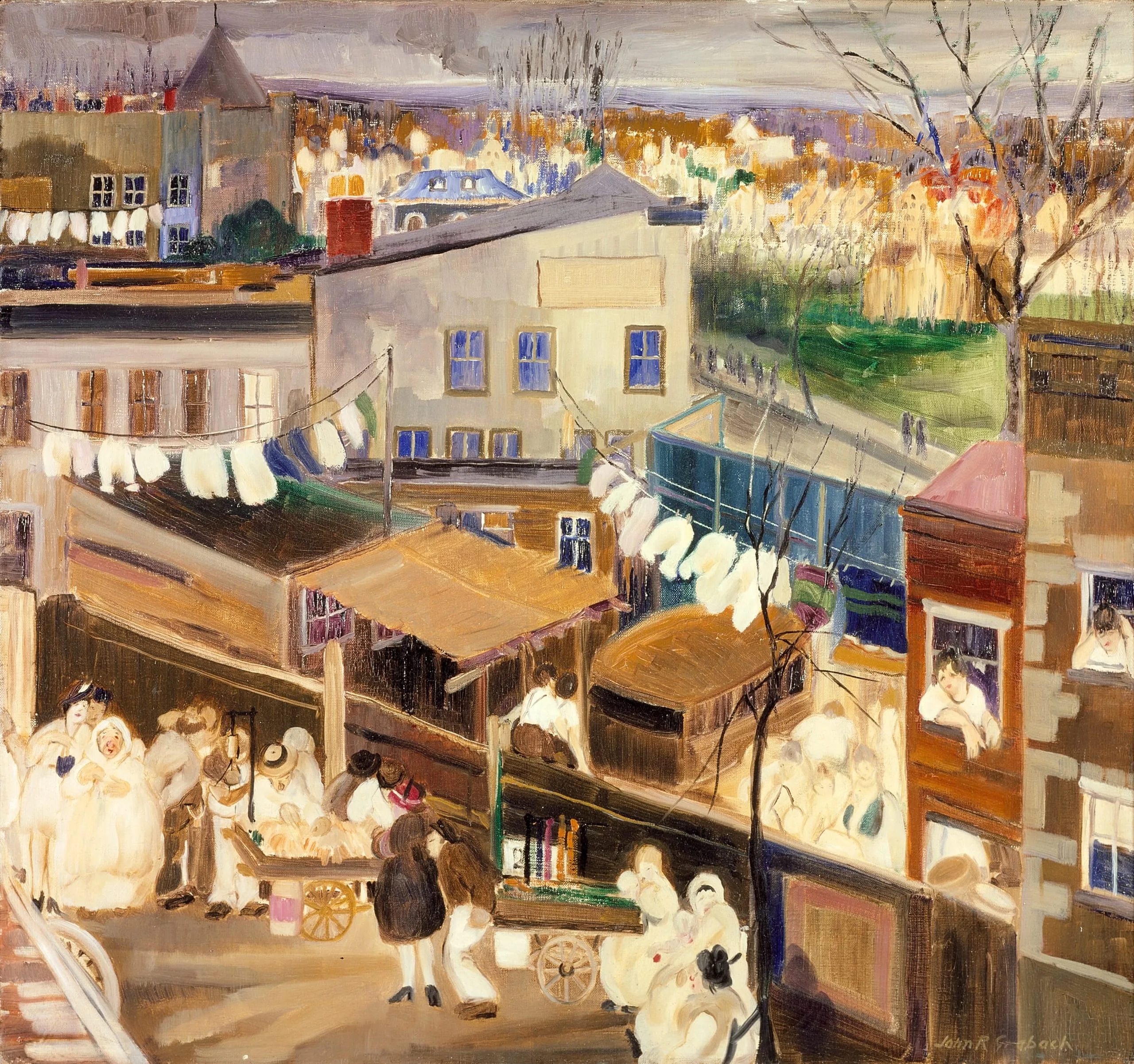 During World War I, when he worked as a mapmaker for the federal government, Grabach traveled to New York every day. He was so struck by the visual image of laundry dancing on clotheslines strung between the upper stories of tenement buildings and the activity of the inhabitants crowding the streets of the poor sections of the city that in the early 1920s he created a series devoted to the theme of wash day. Pushcart Vendors is one of the major paintings from the series. Grabach added to the view of clean white laundry fluttering in the wind an array of peddlers selling their wares from portable pushcarts. The locale was identified as New York when it was exhibited in 1924. Grabach was close friends with GEORGE LUKS and acquainted with the urban scenes of the Ash Can painters, and his paintings of lower-class New York neighborhoods were no doubt inspired by their example.