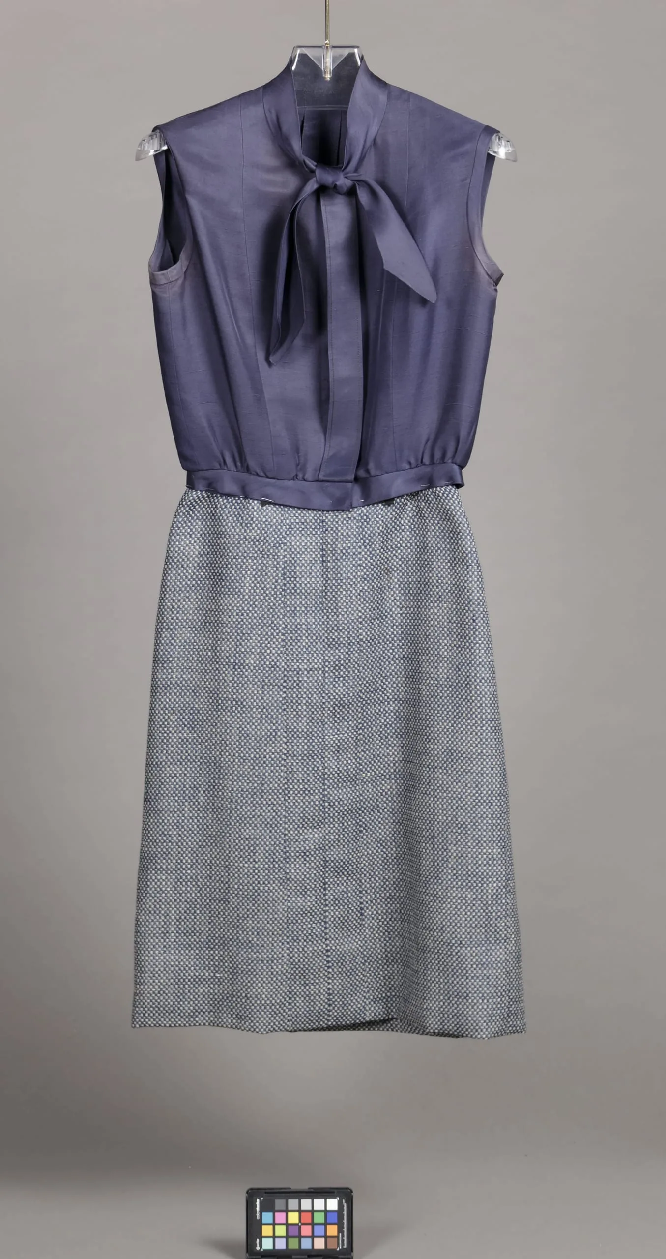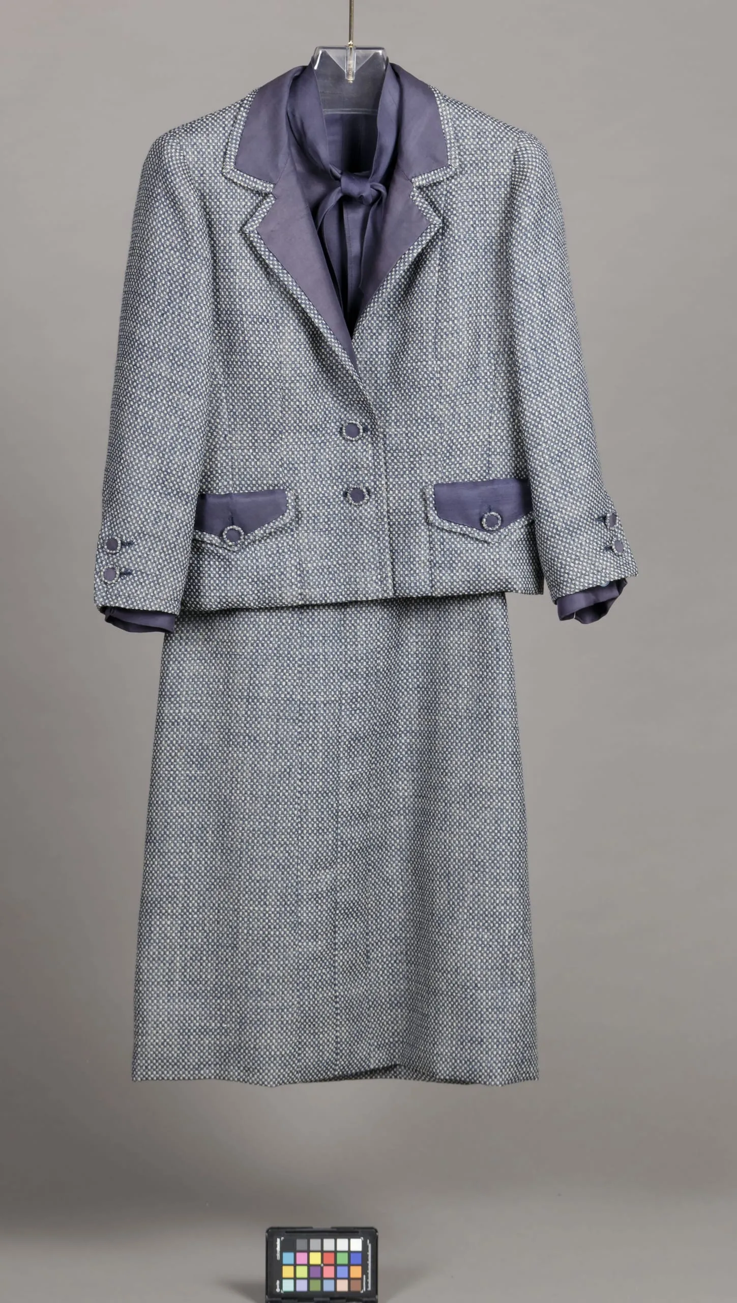 - Jacket: wool double weave, silk twill (shantung); Blouse: silk twill (shantung); Skirt: wool double weave