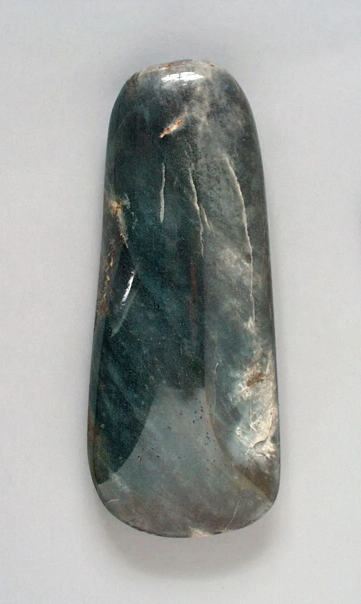 Polished stone celt or tablet of elongated rectangular form, deep teal and slate gray with swirling white and rust-brown veins, high-gloss surface