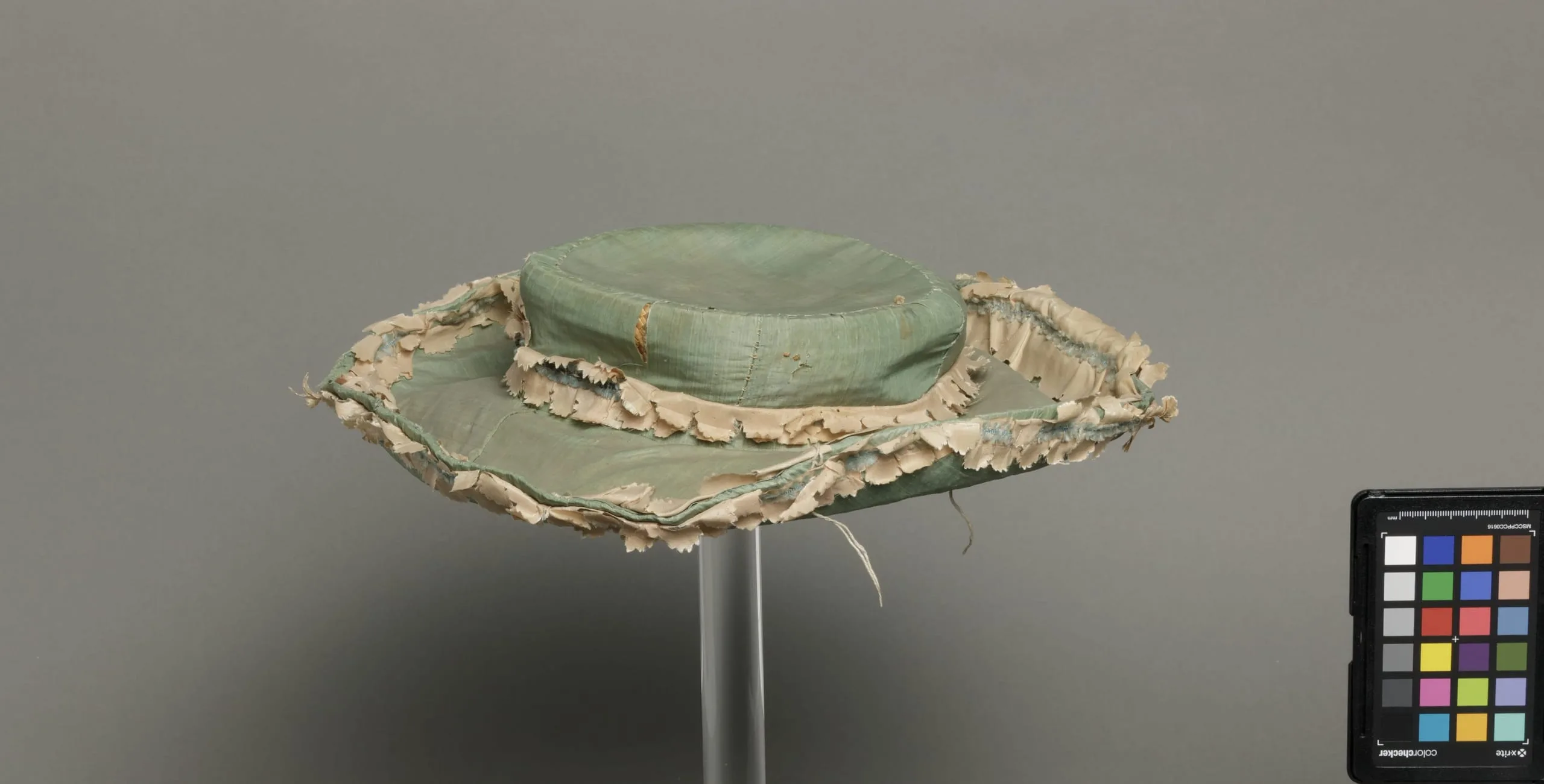 Heavily deteriorated wide-brimmed hat in sage green fabric with frayed cream edging, mounted on a display stand against a gray background