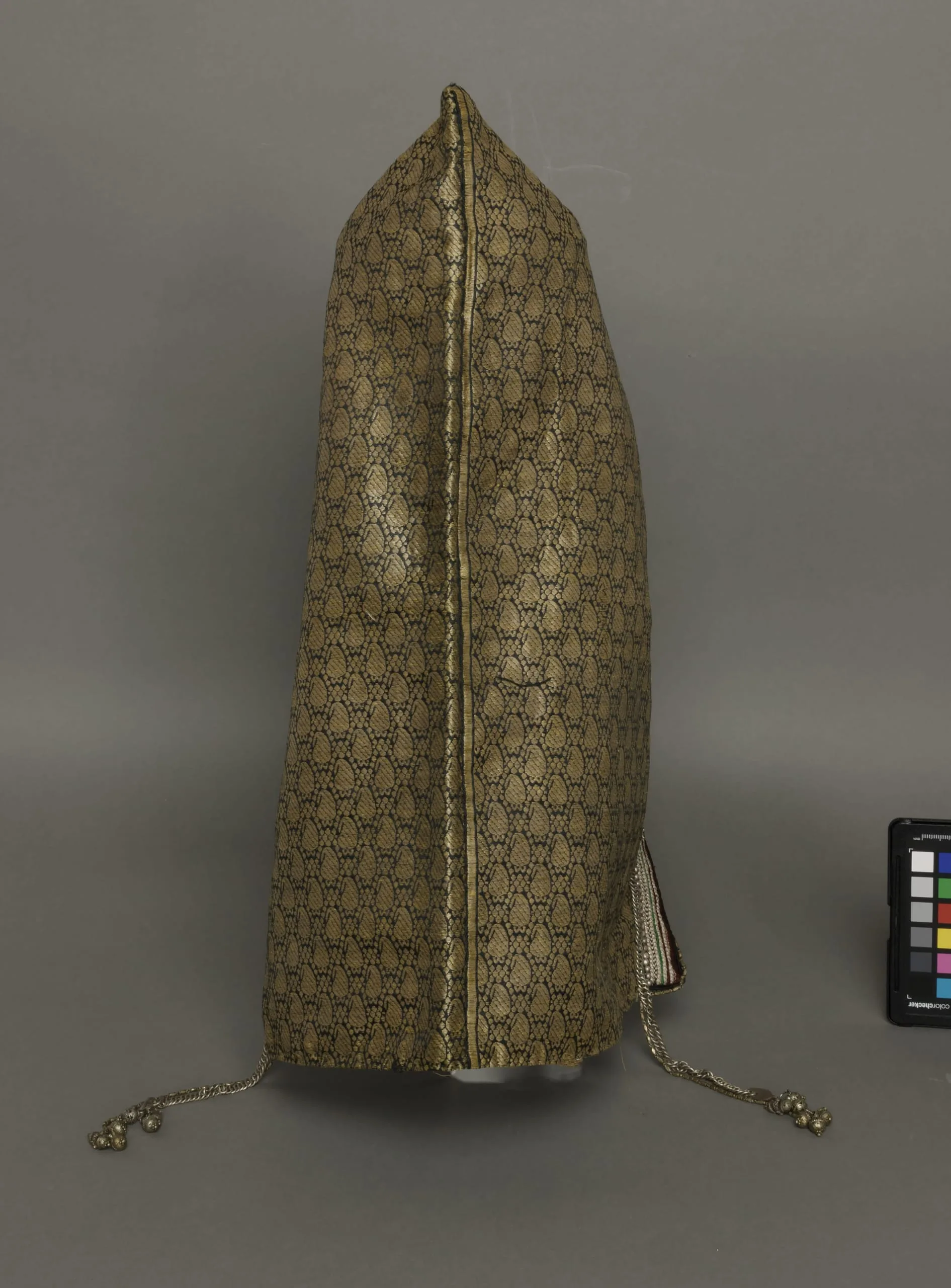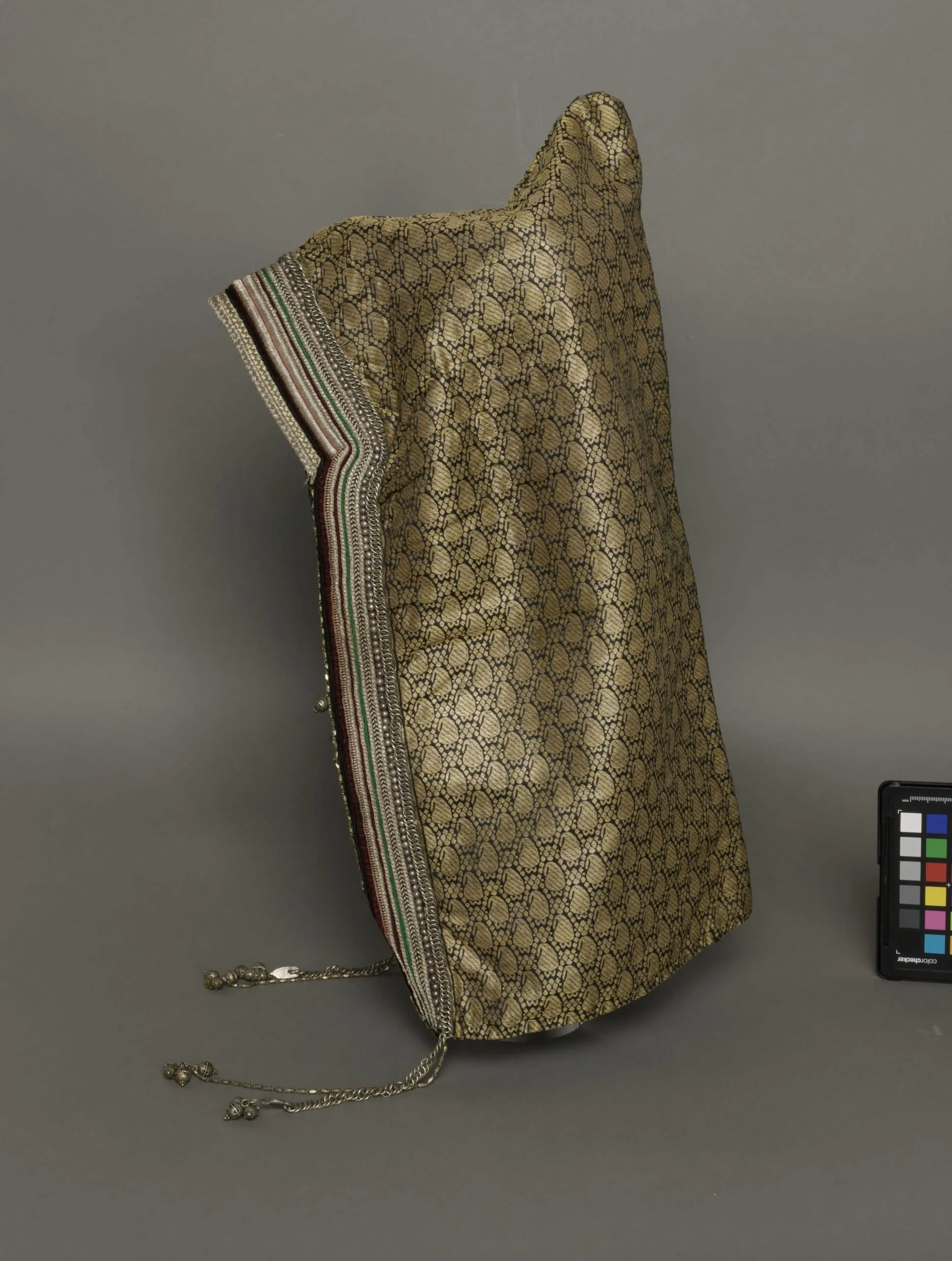 - Silk and metallic-thread satin with metallic-thread weft float patterning bound in twill(lampas) with silk and metallic-thread embroidery, metal chain link, and metal ornaments