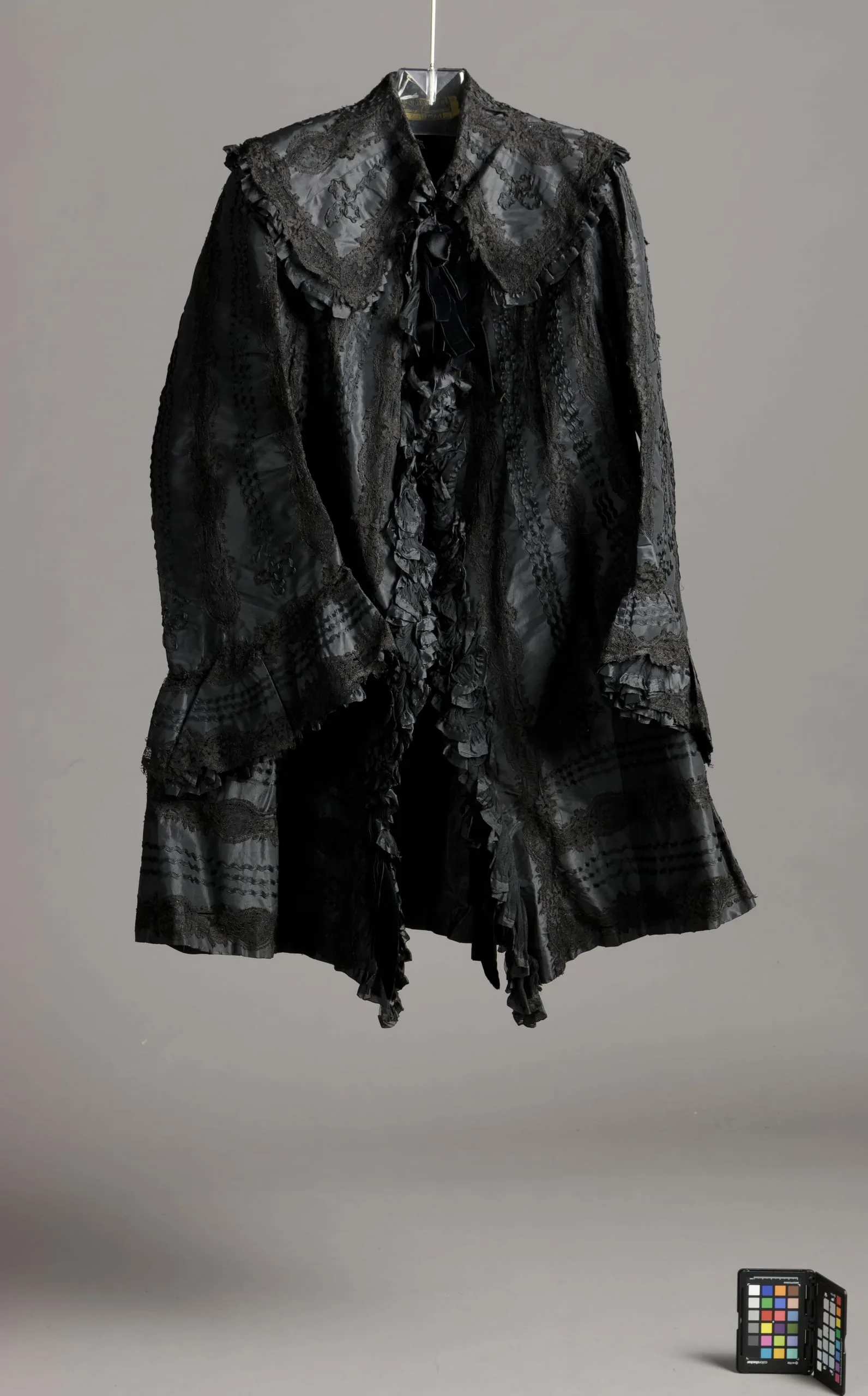 - Silk plain weave (taffeta) with silk satin ribbon, silk lace, silk plain weave (chiffon), and silk velvet ribbon