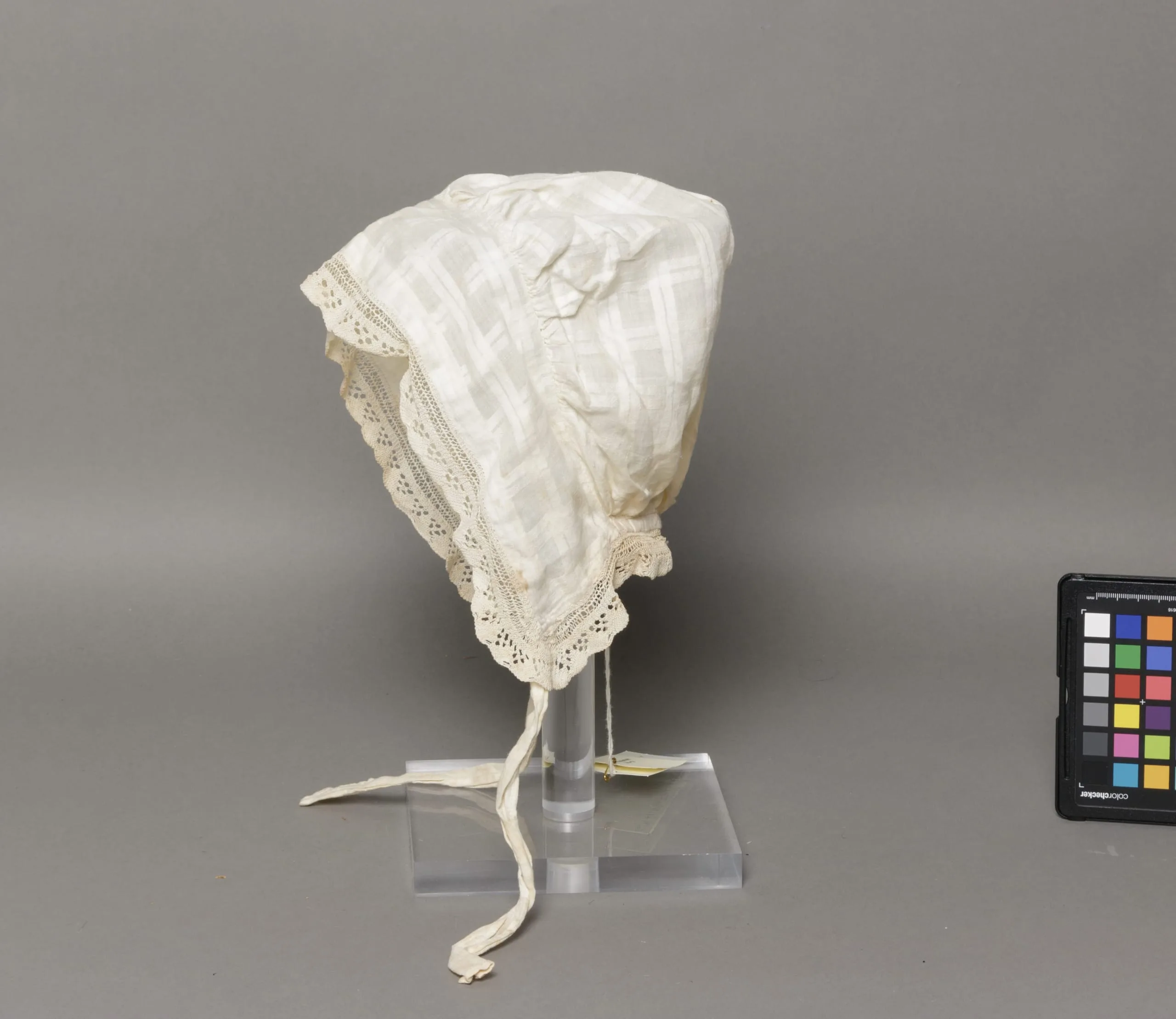 Ivory woven fabric bonnet with cream lace trim and ribbon ties, displayed on a clear acrylic stand against a gray background