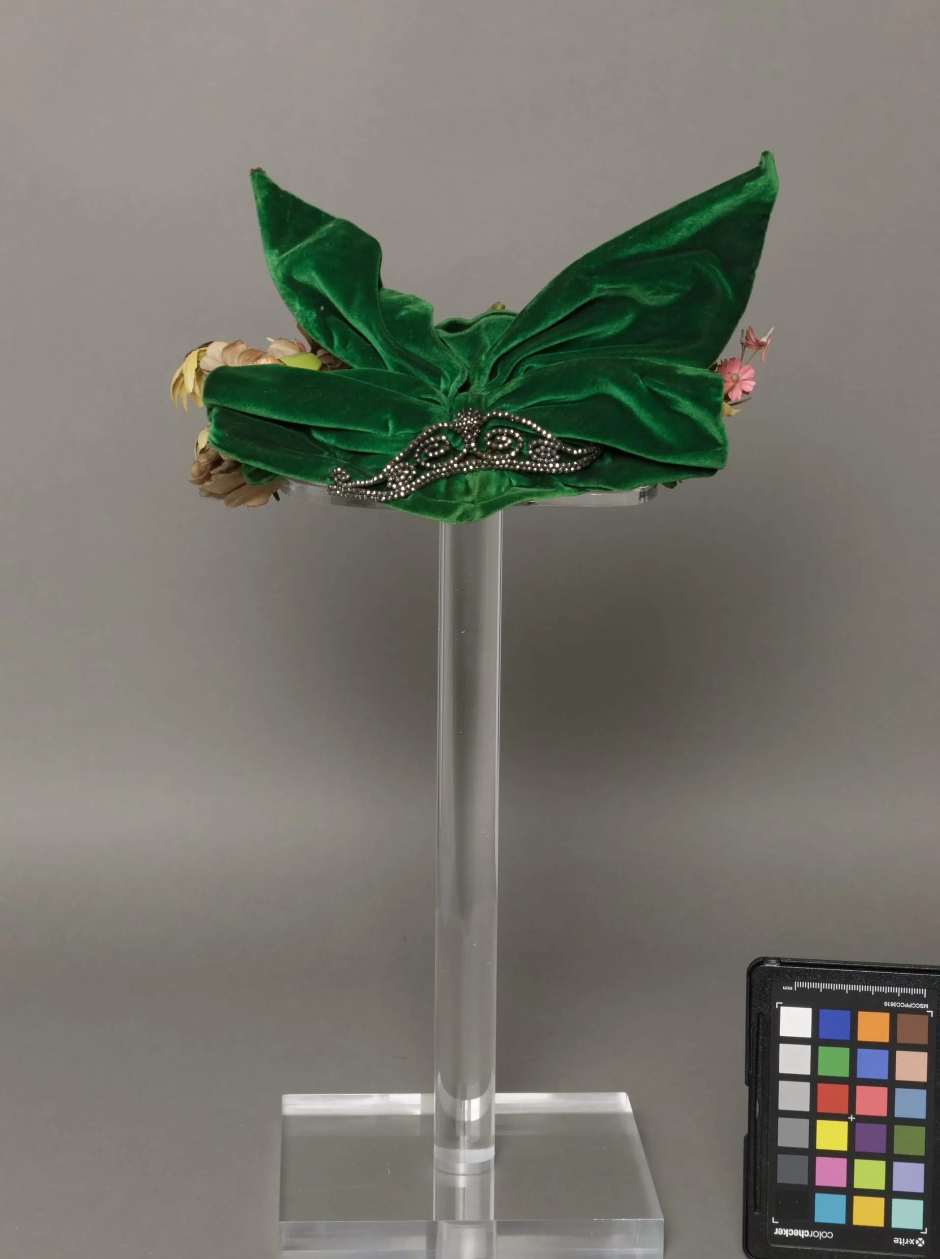 Small woman's hat in emerald green velvet with two upswept wing-like points, rhinestone ornament at center front, and clusters of artificial flowers on each side, displayed on a clear acrylic stand