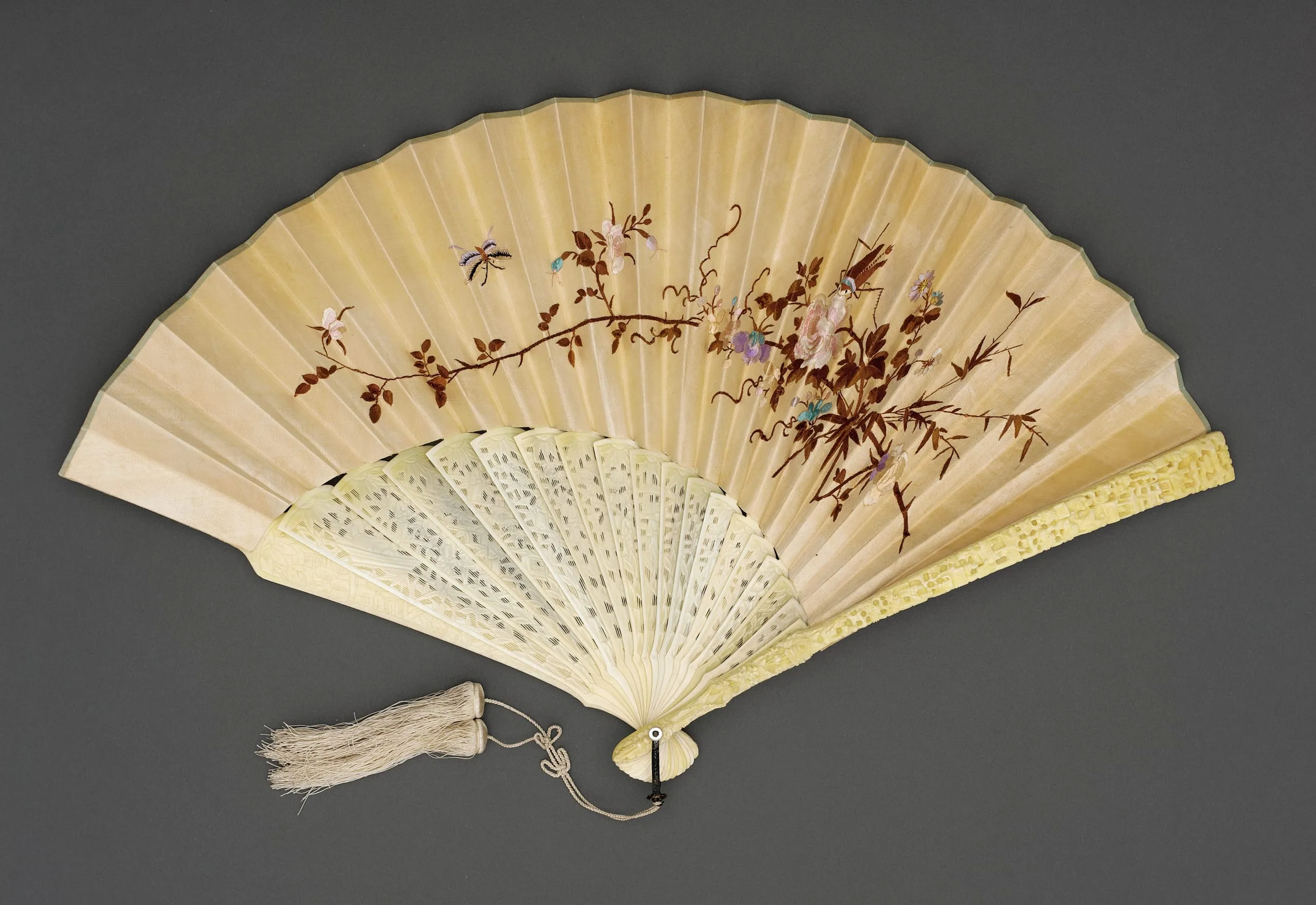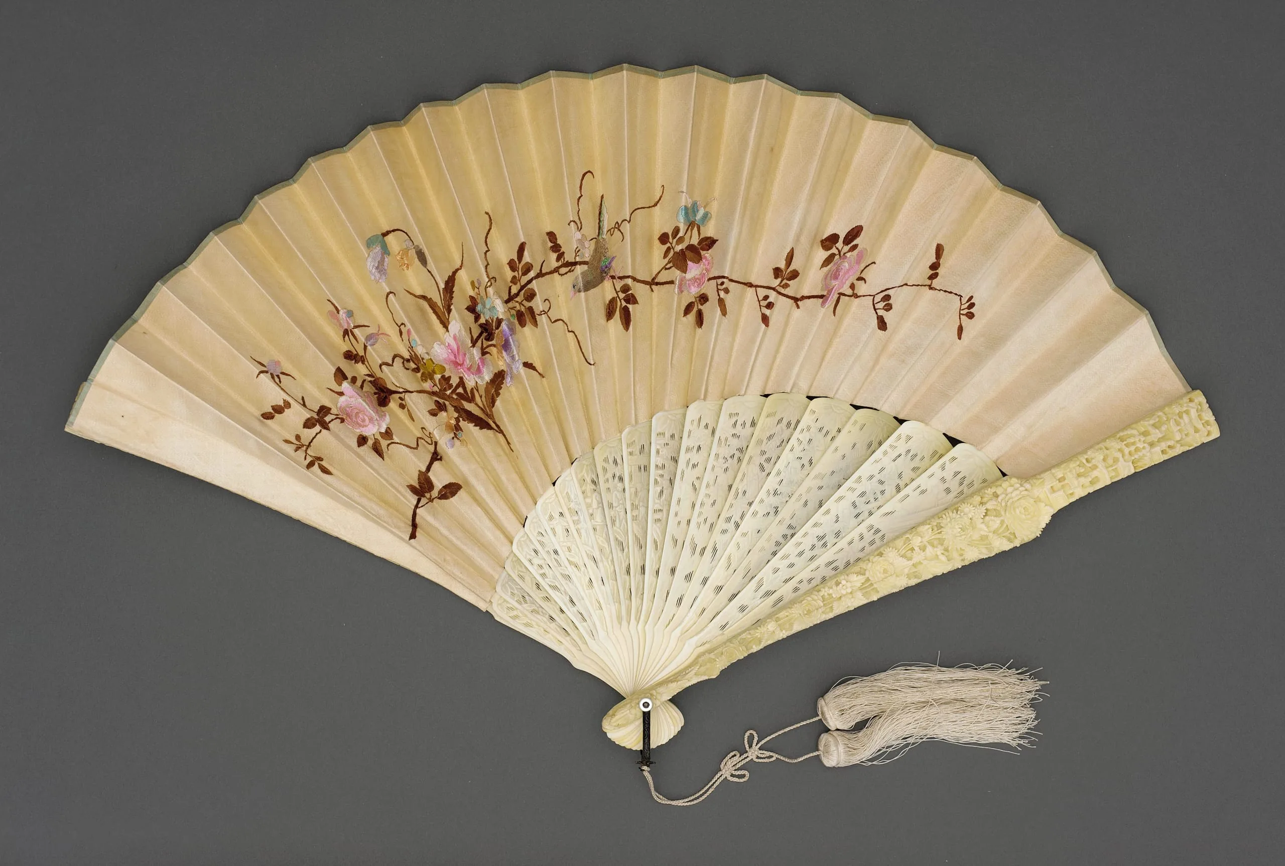 - a) Fan: Silk leaf, bone sticks and guards, metallic loop, mother-of-pearl button, silk tassel