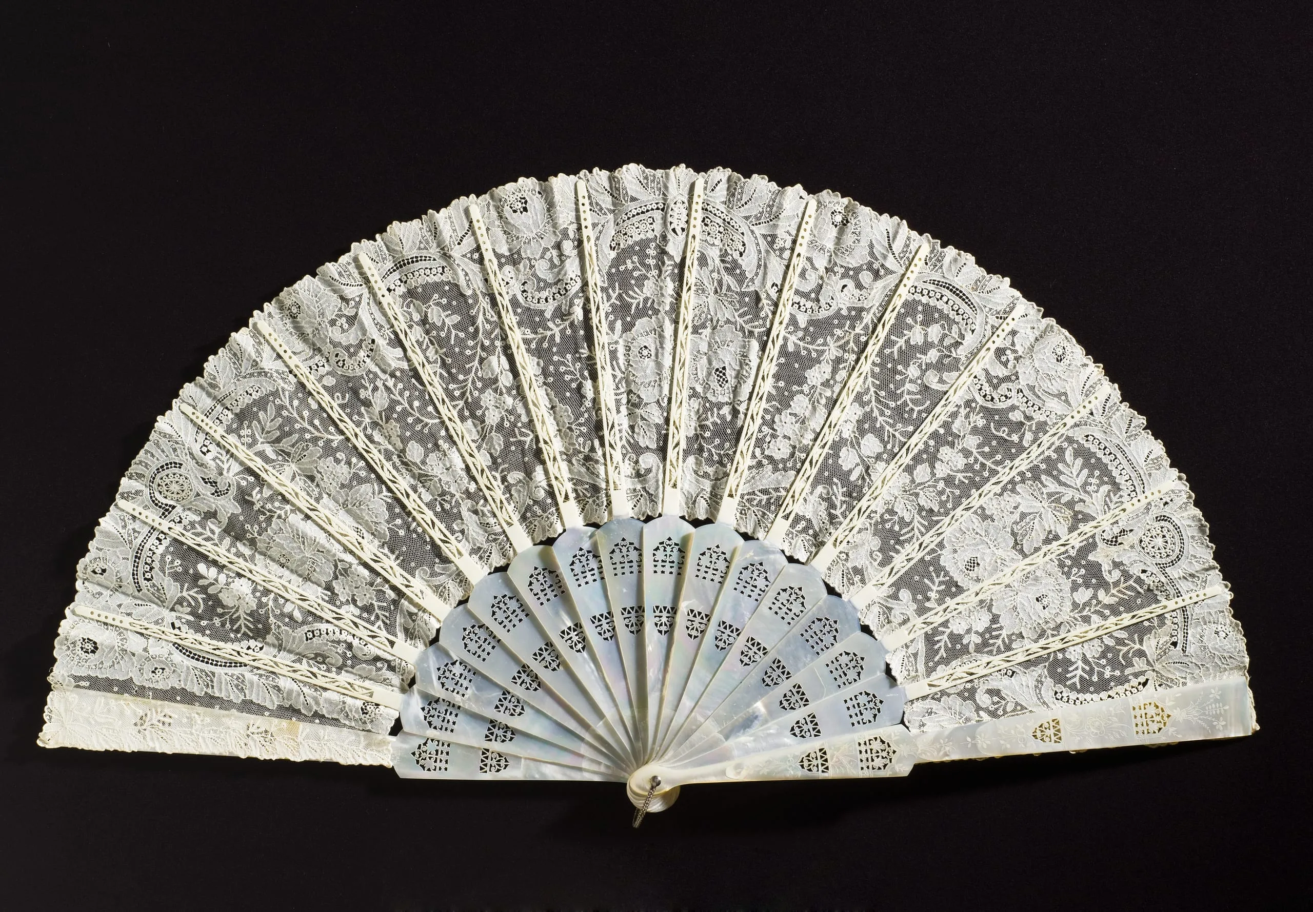- Cotton lace, bone, mother-of-pearl, and metal