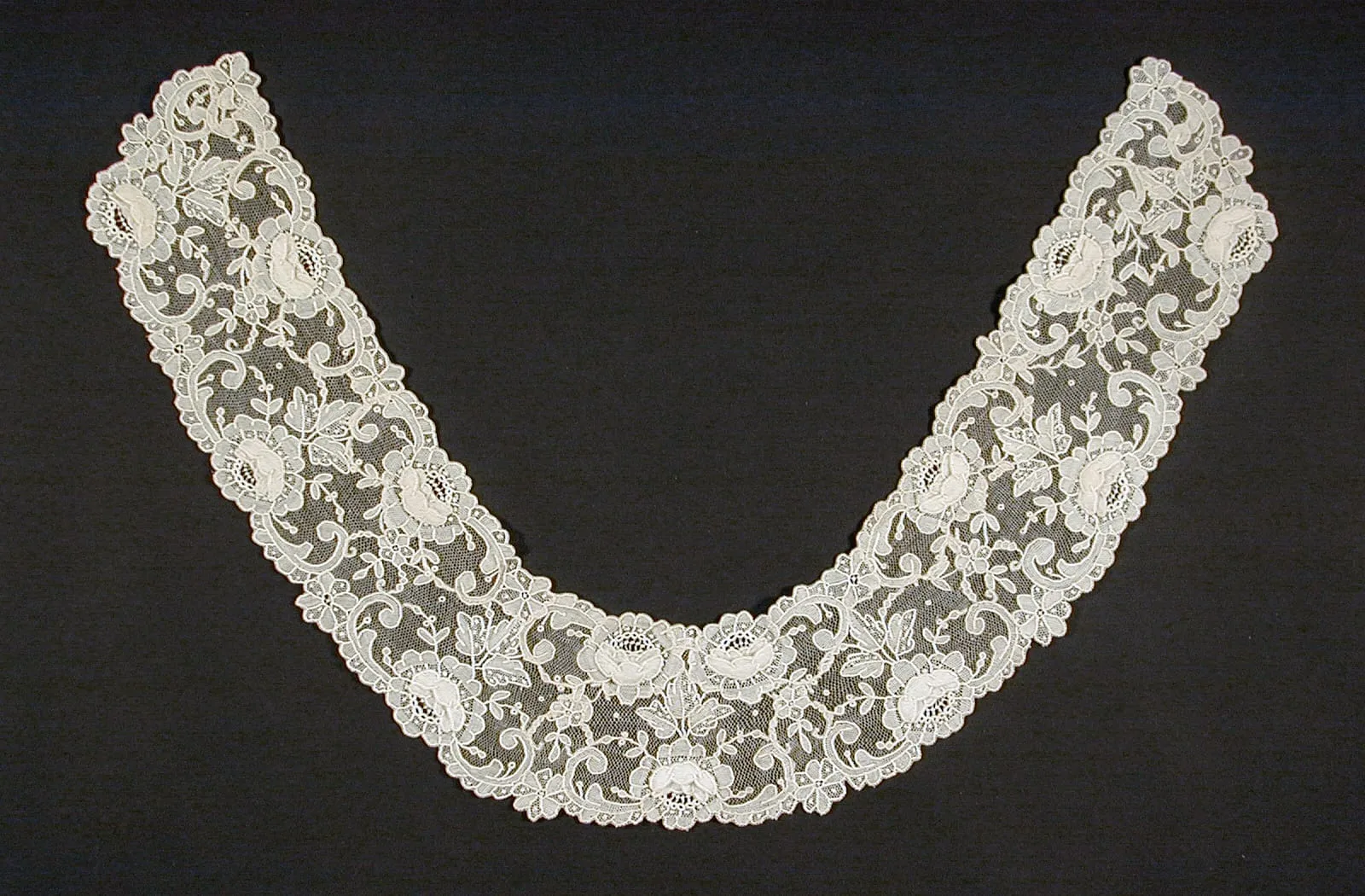 Cream-colored lace collar in a U-shape, displayed flat, with a scalloped outer edge and an allover pattern of scrolling vines, raised flower heads, and leaf motifs on a fine mesh ground