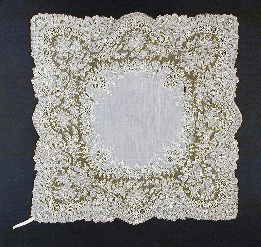 Square ivory-white lace handkerchief with a plain sheer center panel surrounded by a wide border of needle lace worked with scrolling vines, floral rosettes, and leaf sprays, finished with a scalloped picot edge