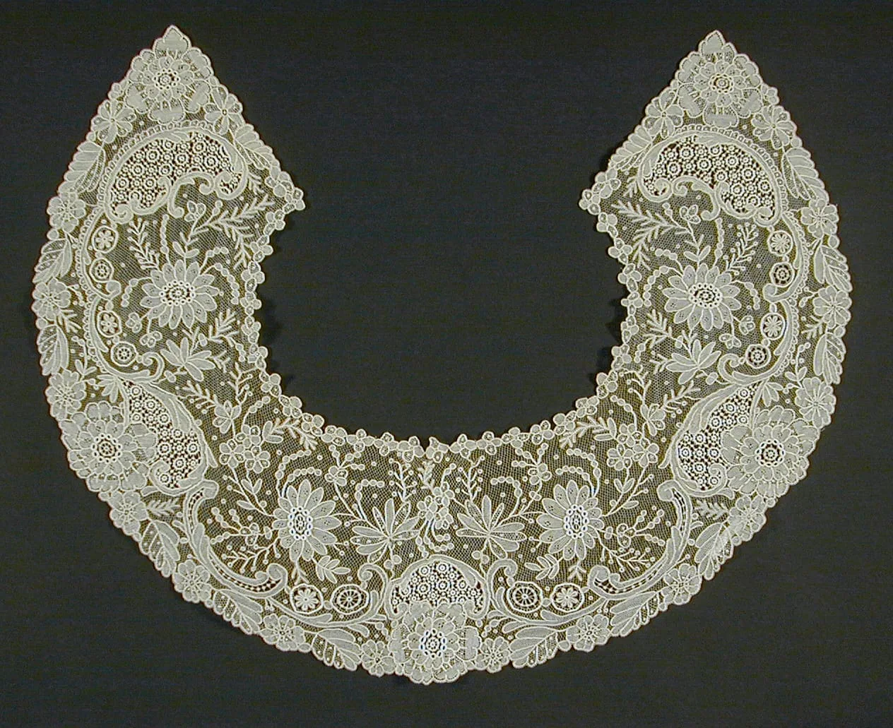 Cream-colored lace collar in a wide crescent shape, displayed flat, with dense floral and foliate motifs on a fine mesh ground and scalloped picot edges