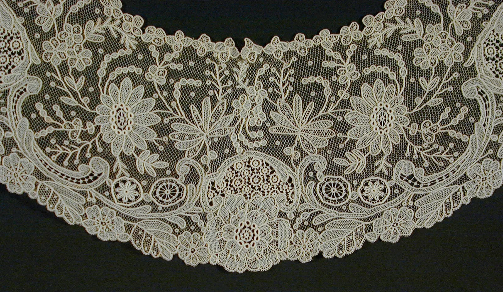 Needle lace collar in ivory, semicircular form with densely worked floral and foliate motifs, including large daisy-like blooms, scrolling stems, and scalloped edges, against a dark background.