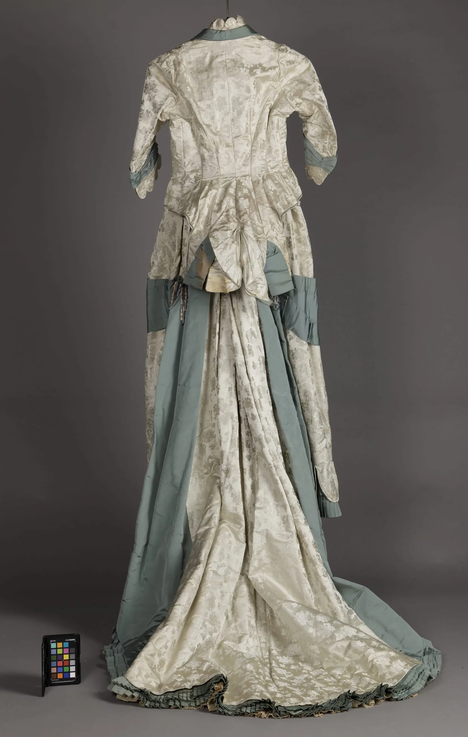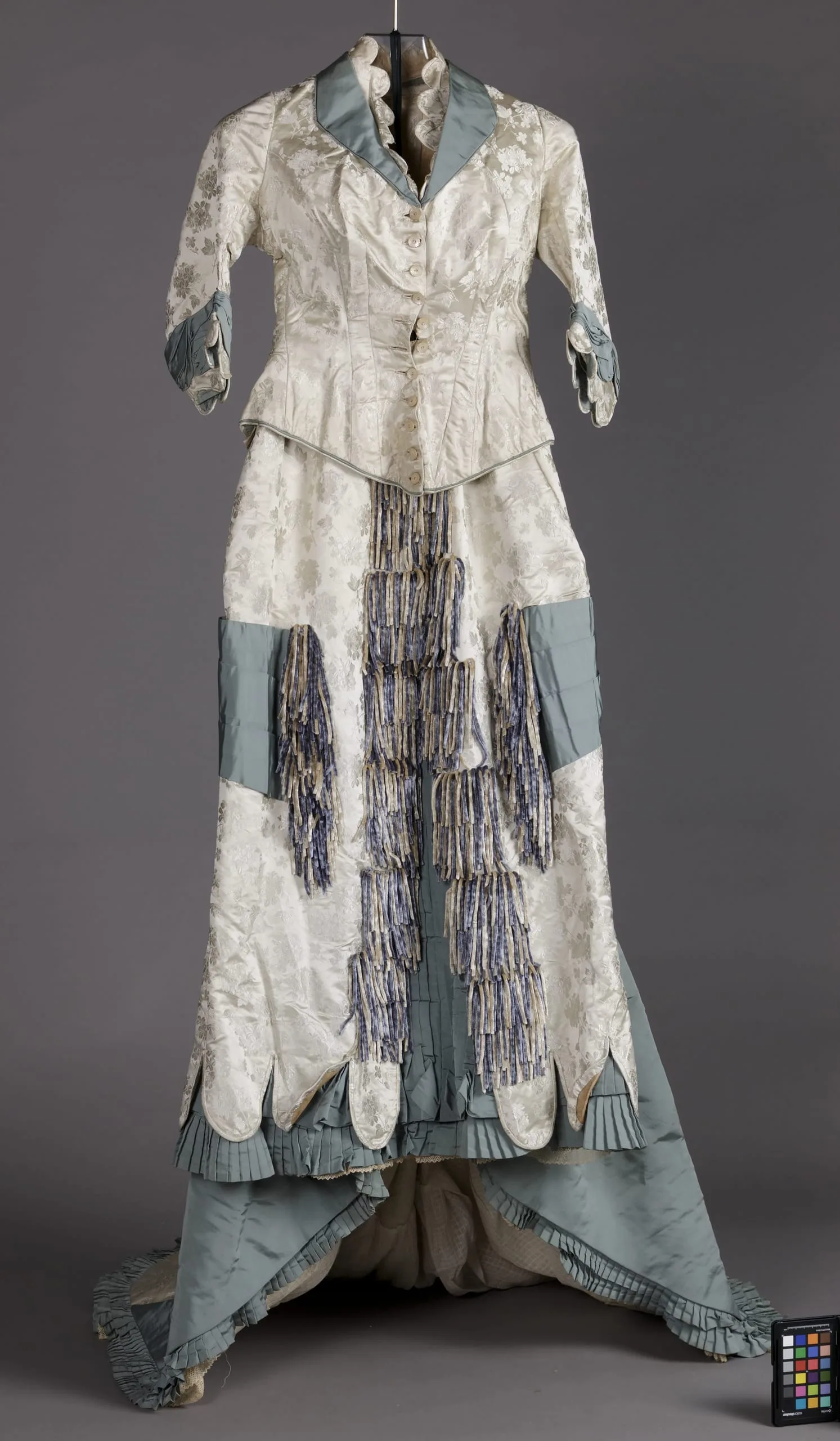 - Bodice: silk satin with weft patterning, silk plain weave (faille), silk gauze, and mother-of-pearl buttons; Skirt: silk satin with weft patterning, silk plain weave (faille), and silk chenille