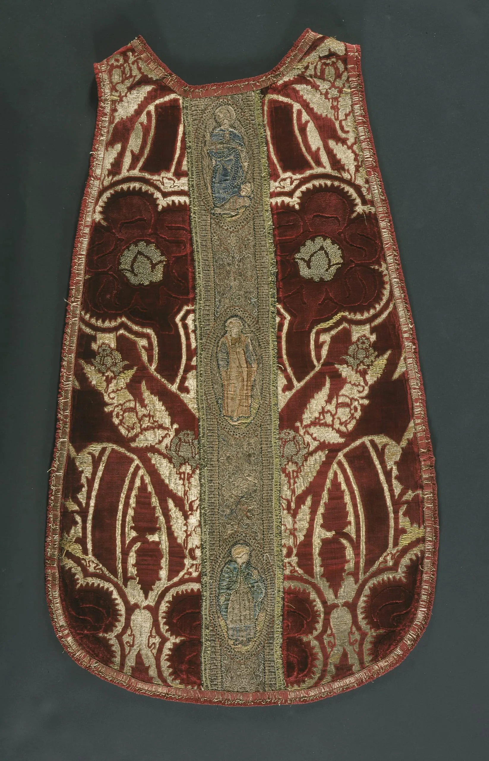 - Chasuble: silk cut pile-on-pile and voided velvet on silk satin ground faced with metallic-thread wefts bound in twill, with metallic-thread weft-looped patterning (bouclé or allucciolato) and silk and metallic thread passementerie; Ophrey: linen plain weave with metallic-, silk-, and wool-thread embroidery and silk plain weave appliqué