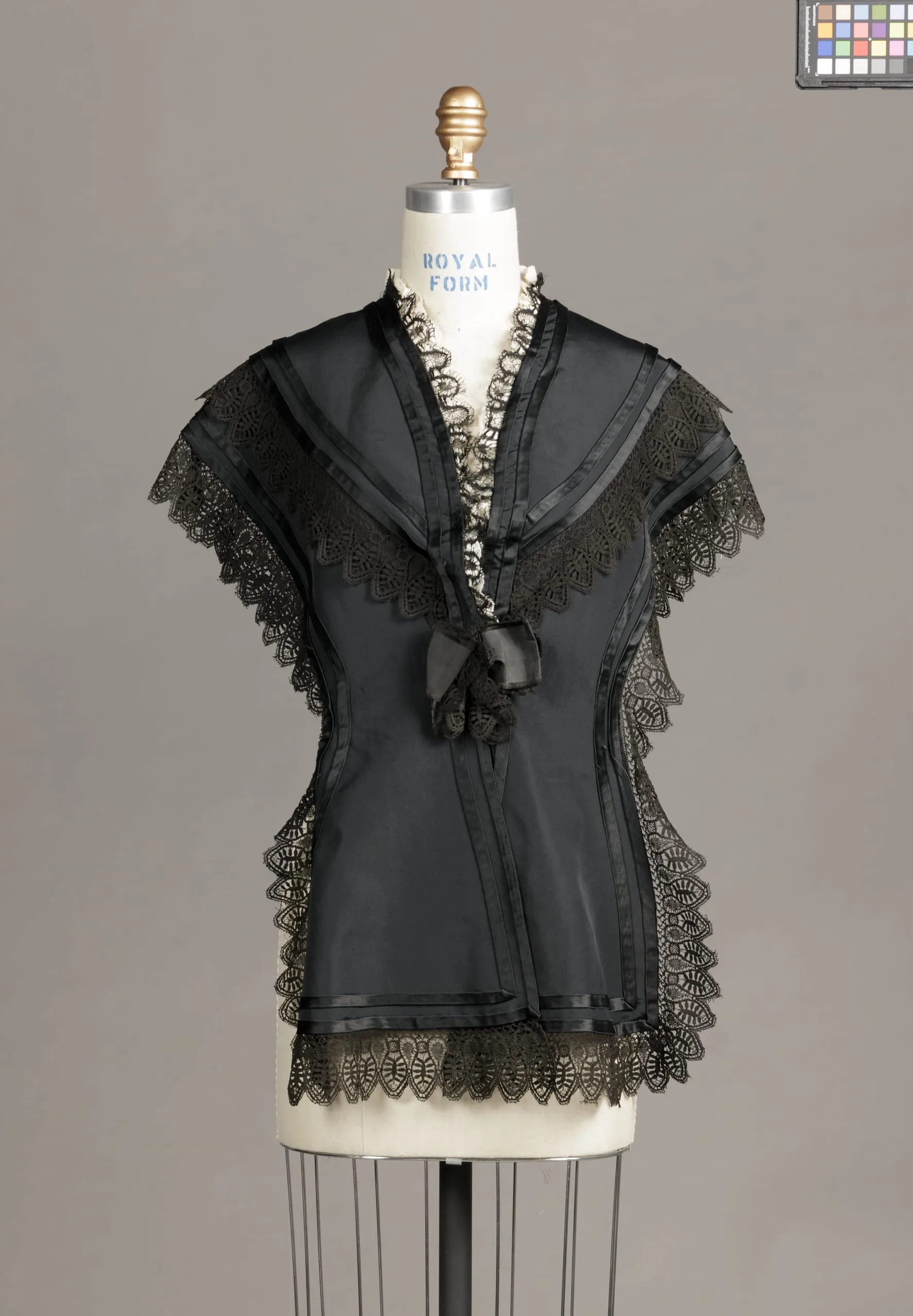 - Silk plain weave (faille), silk satin, wool machine-made lace, cotton lace, and silk plain weave (taffeta) ribbon